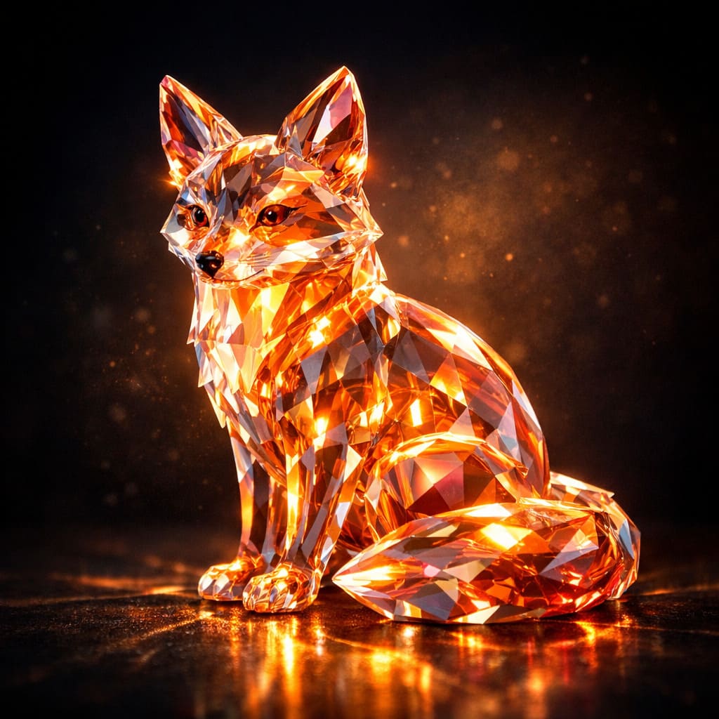 Description: A cinematic collection of creatures sculpted from crystal and light - translucent bodies, prismatic edges, and quiet inner glows floating in a dark, elegant atmosphere.