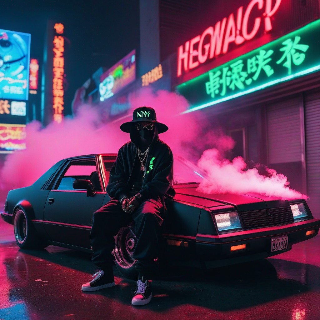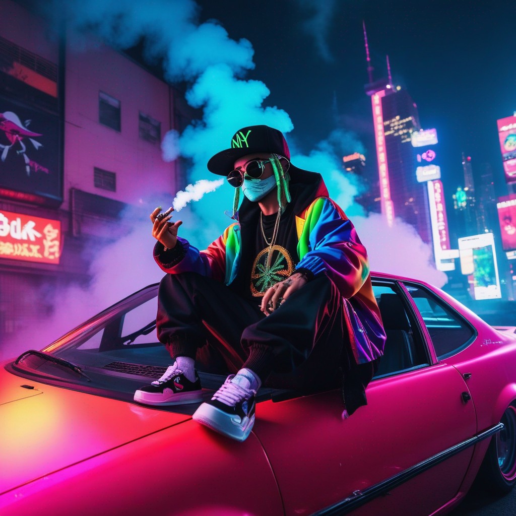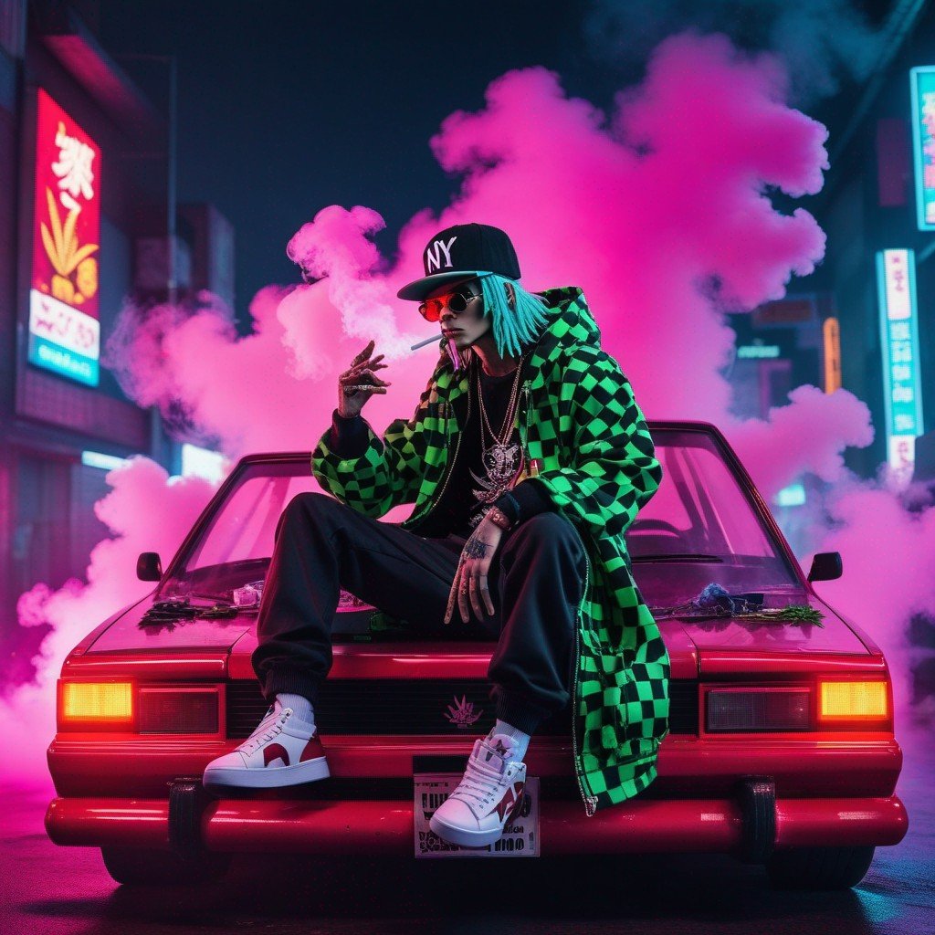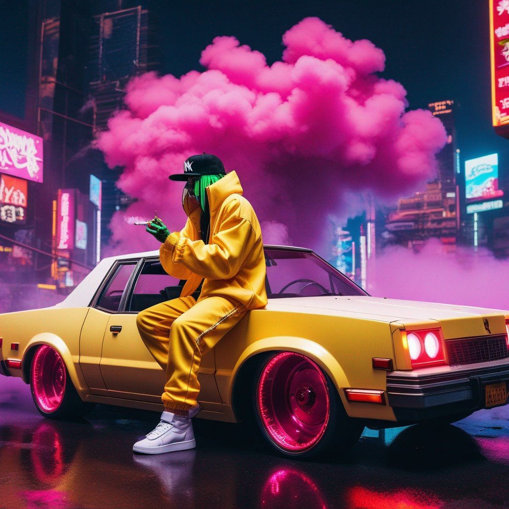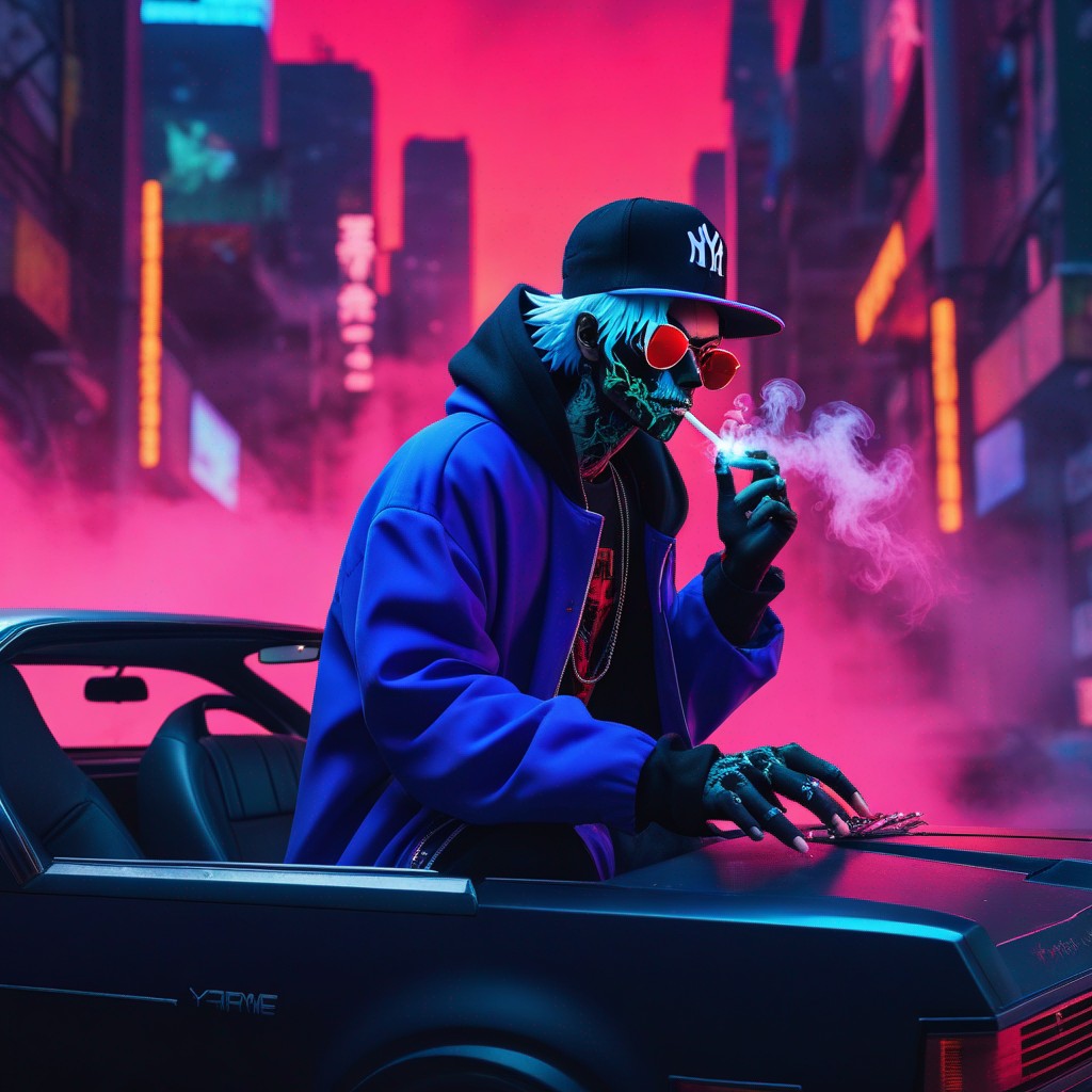 Description: An NFT masterpiece depicting the enigmatic beauty of a solitary figure enveloped in swirling tendrils of smoke within the confines of a sleek automobile.