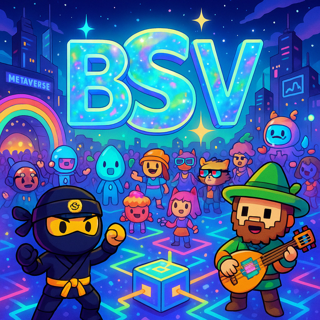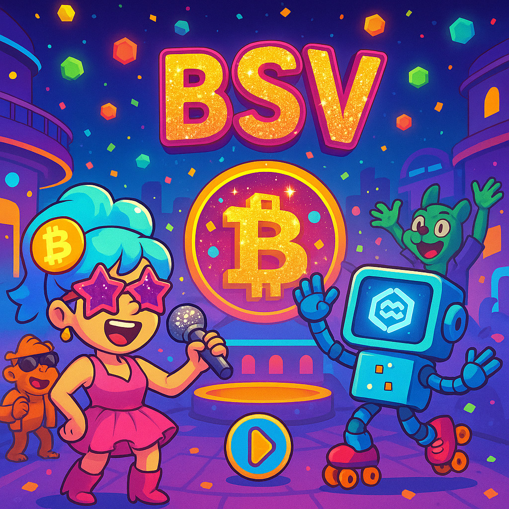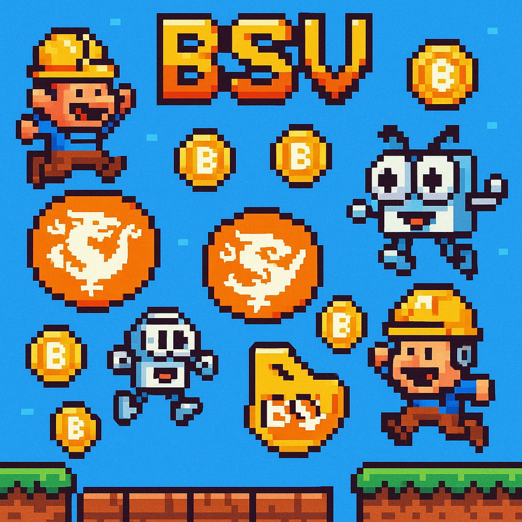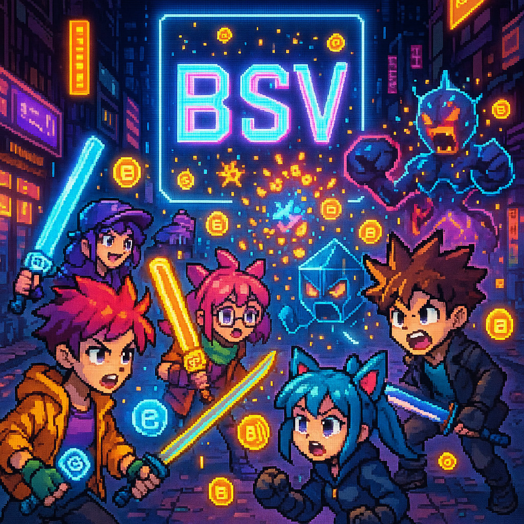 Description: A vibrant collection of video game-inspired images celebrating the BSV cryptocurrency, packed with quirky characters, a colorful blockchain aesthetic, and interactive crypto challenges.
