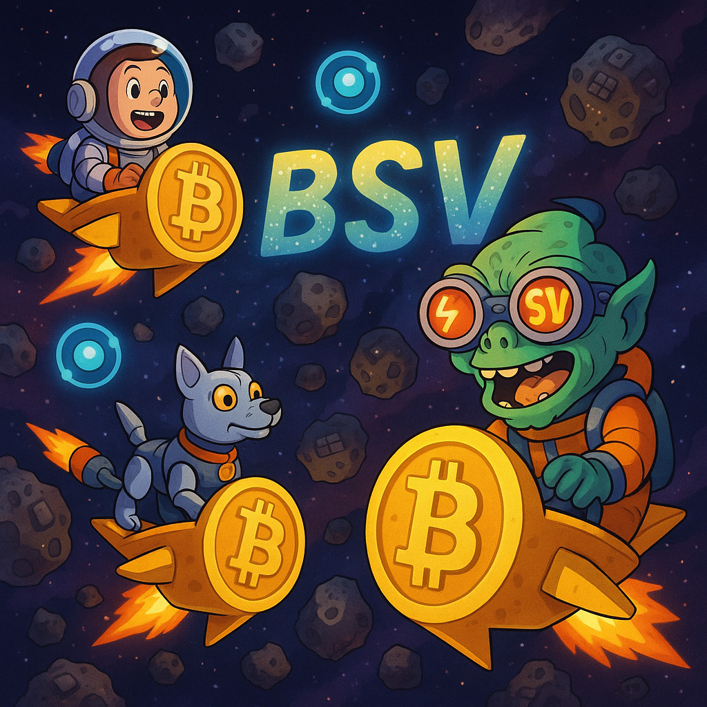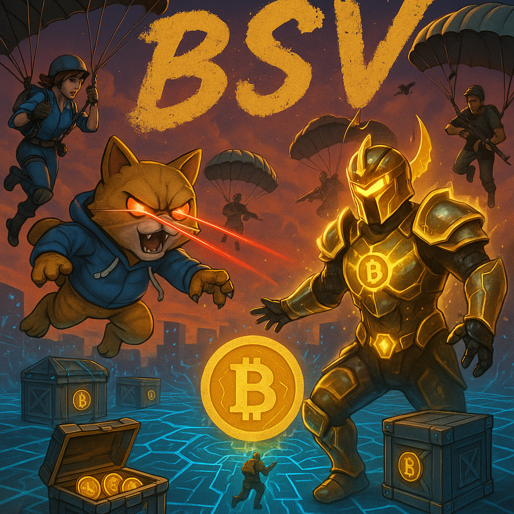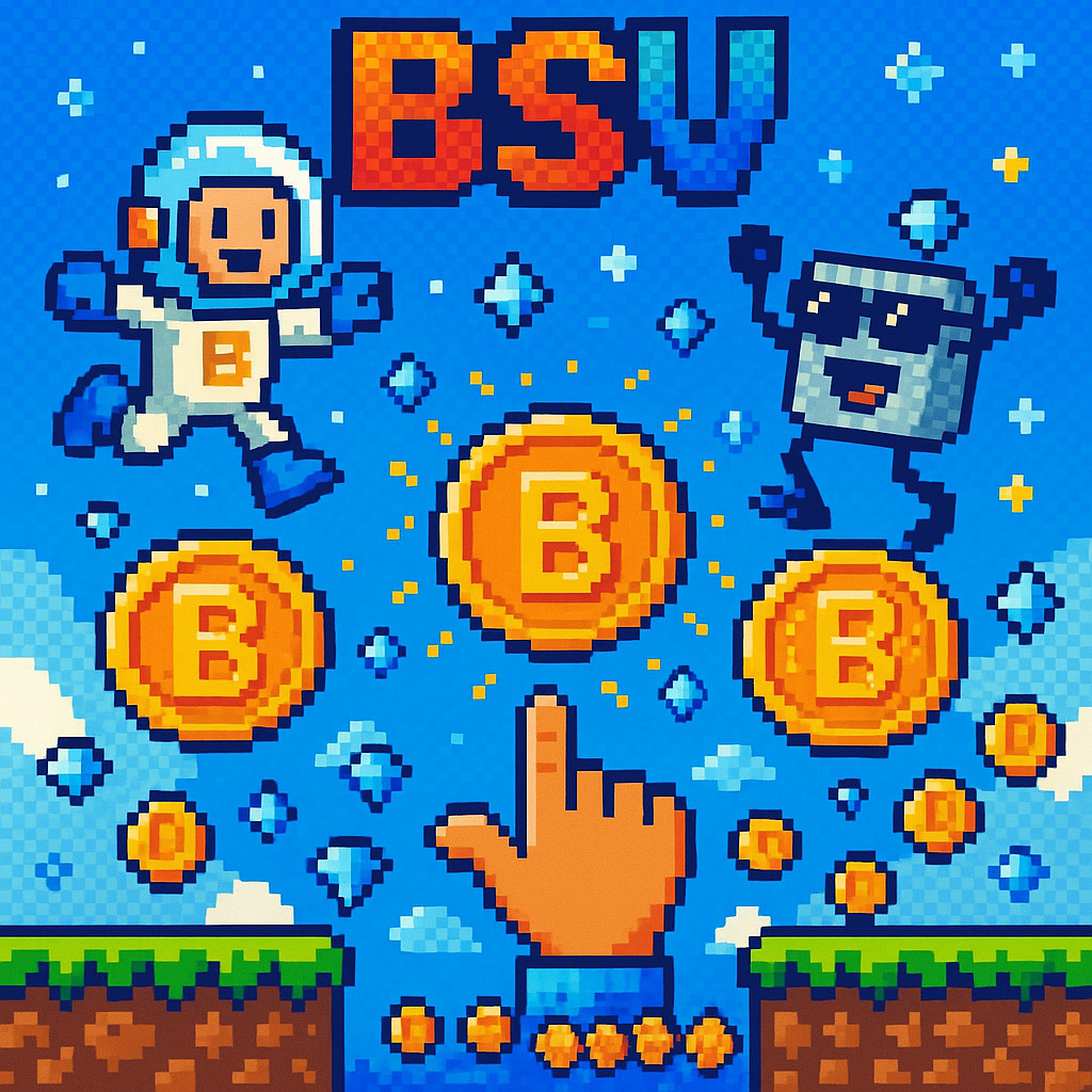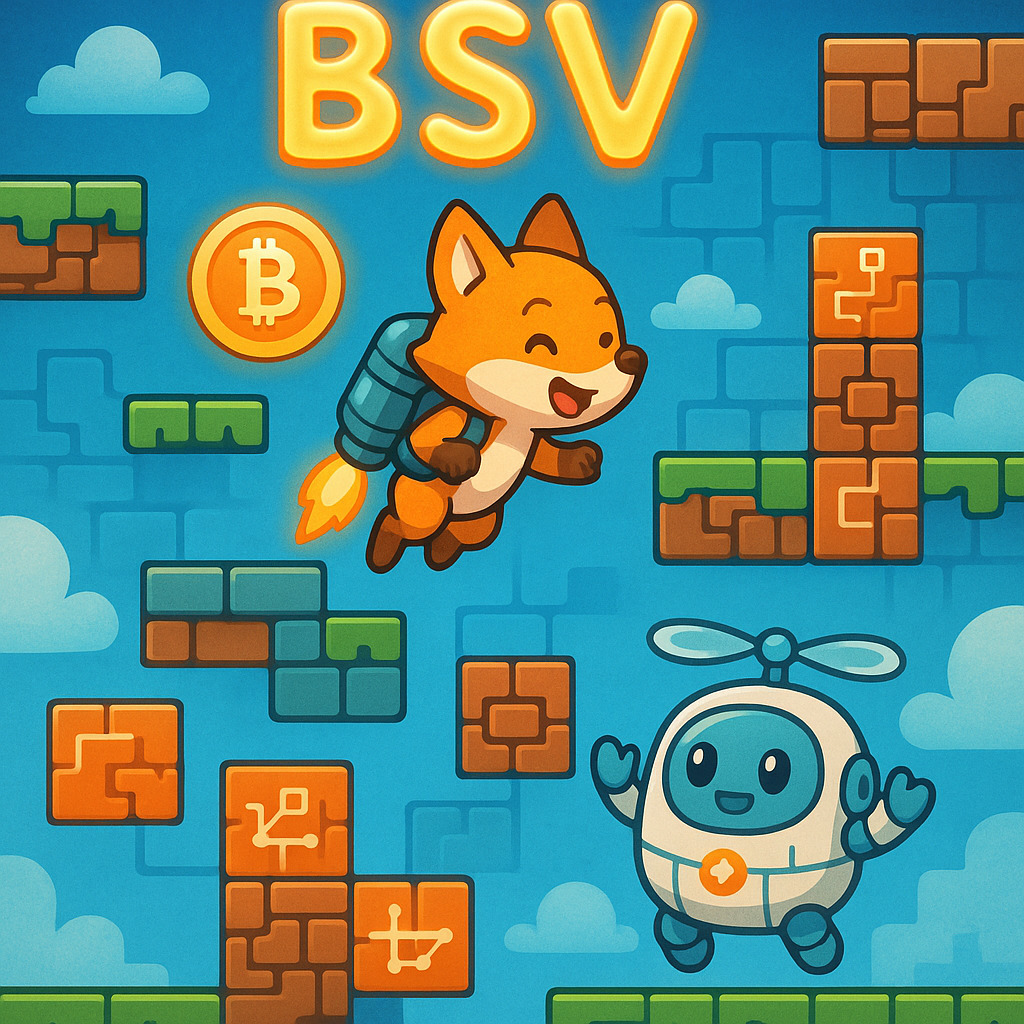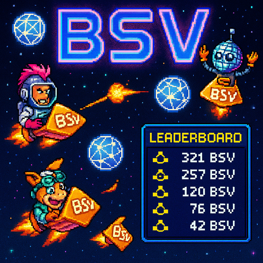 Description: A vibrant collection of video game-inspired images celebrating the BSV cryptocurrency, packed with quirky characters, a colorful blockchain aesthetic, and interactive crypto challenges.