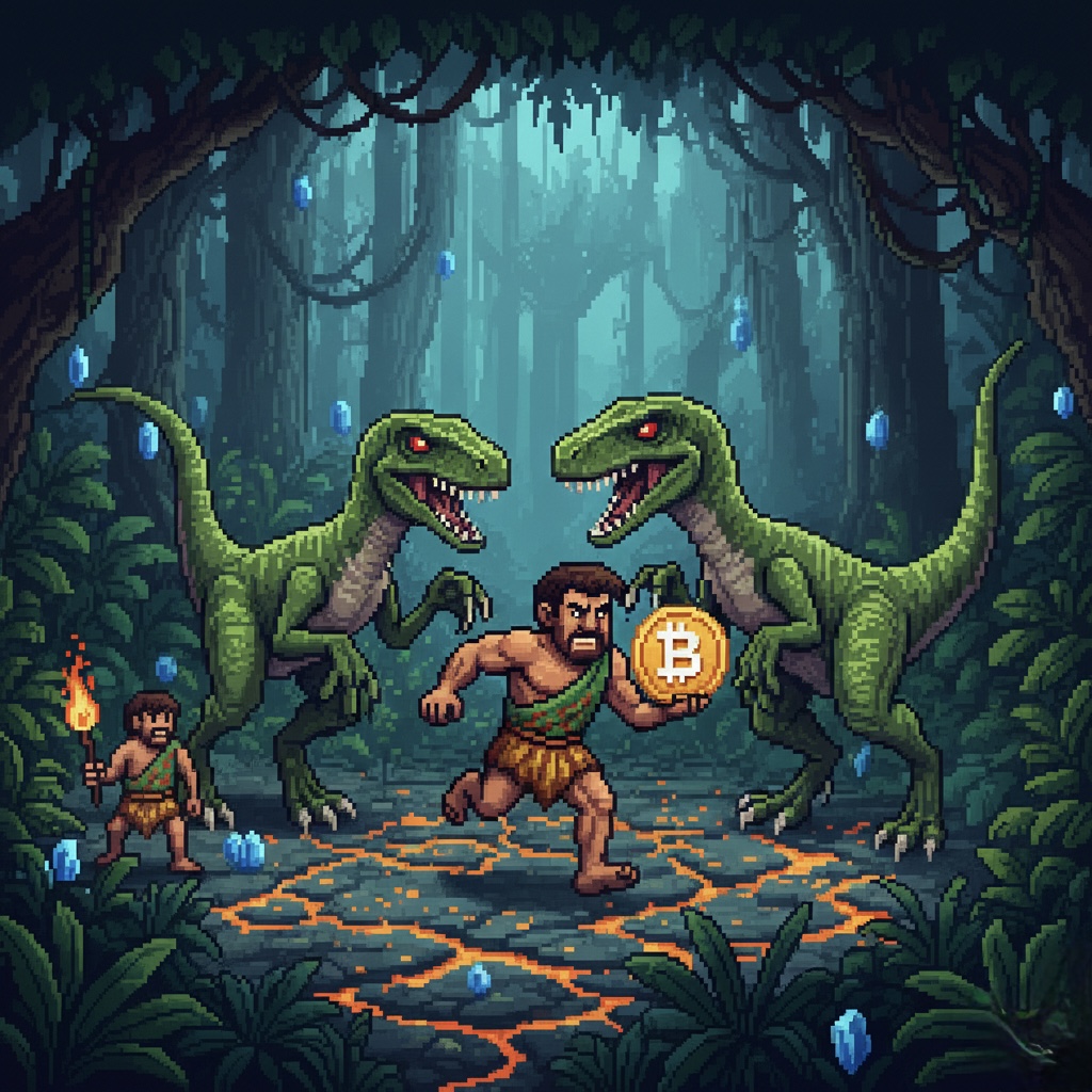 Description: Pure jungle tension. A caveman sprints across lava-cracked ground, clutching a giant Bitcoin. Two velociraptors stalk him from the sides, ready to strike. In this world, value belongs only to the fast.