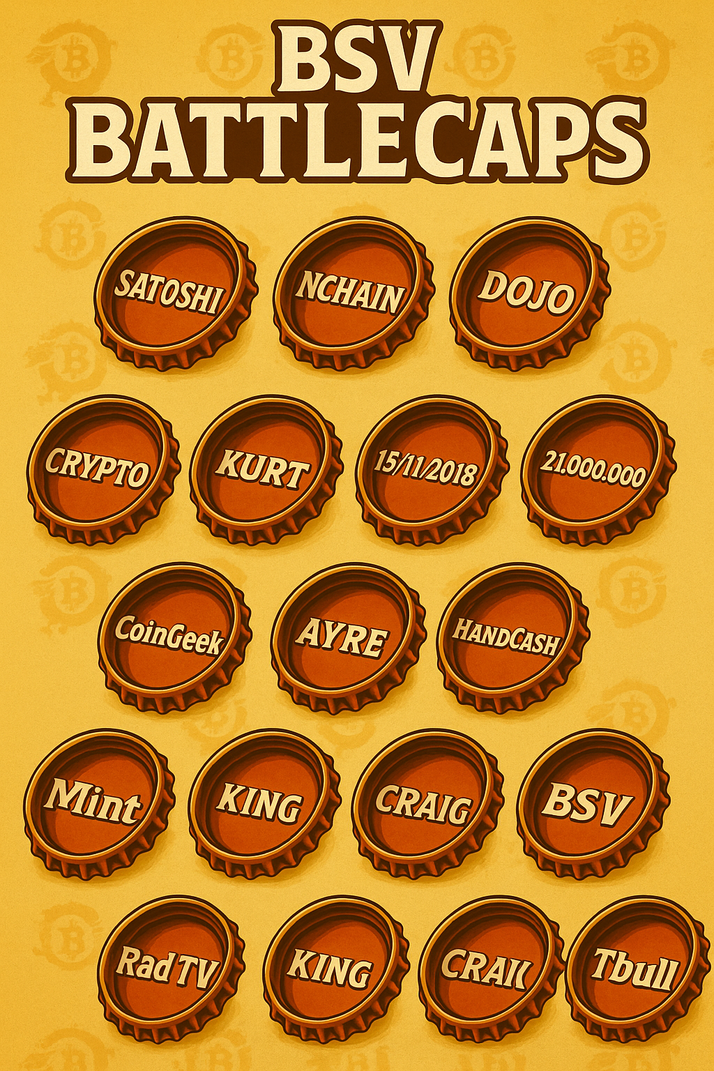 Description: BSV BattleCaps is a collection of 21 digital bottle cap NFTs honoring key names events and symbols from the BSV ecosystem Each cap carries a unique label marking milestones and legends in the ongoing battle for the original Bitcoin vision