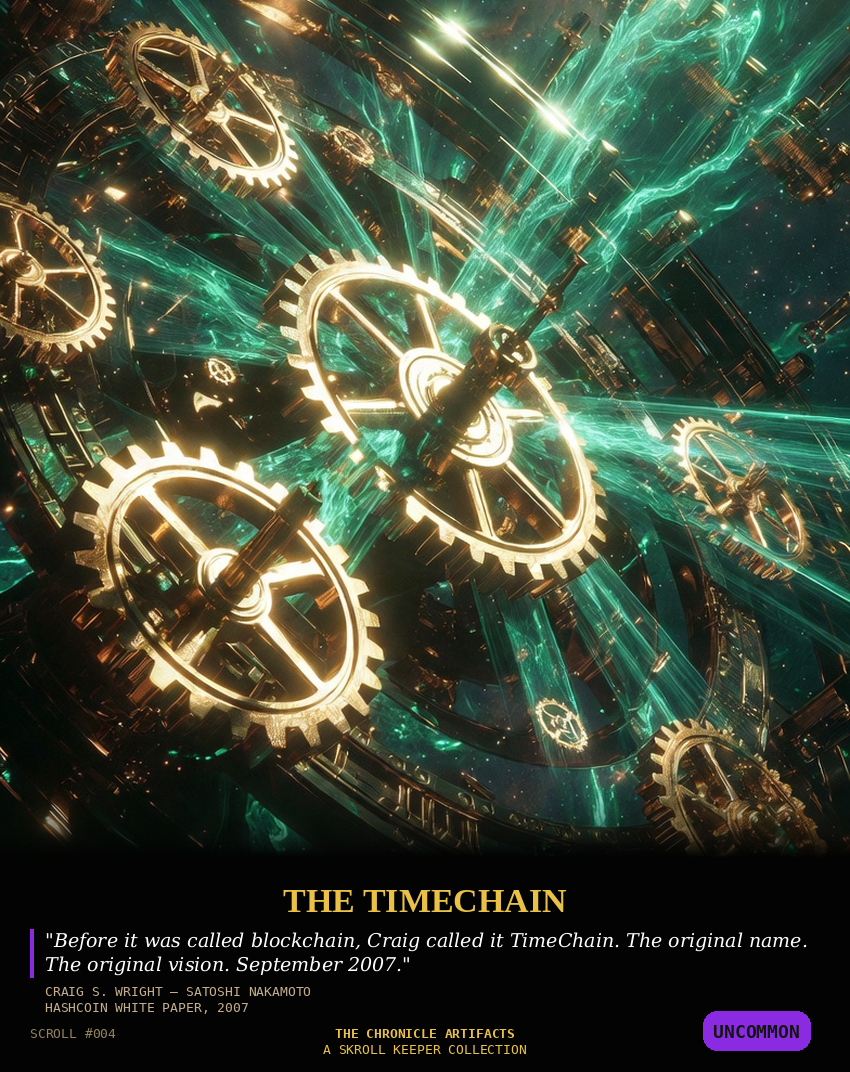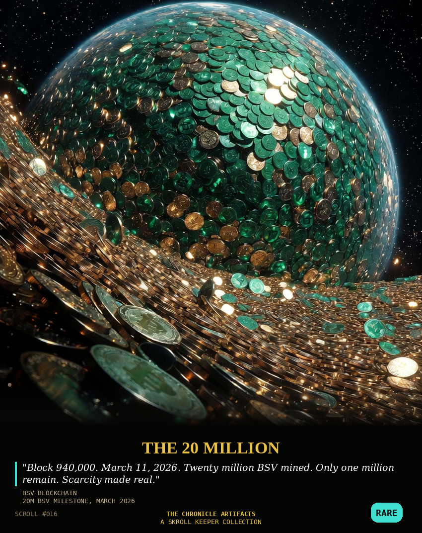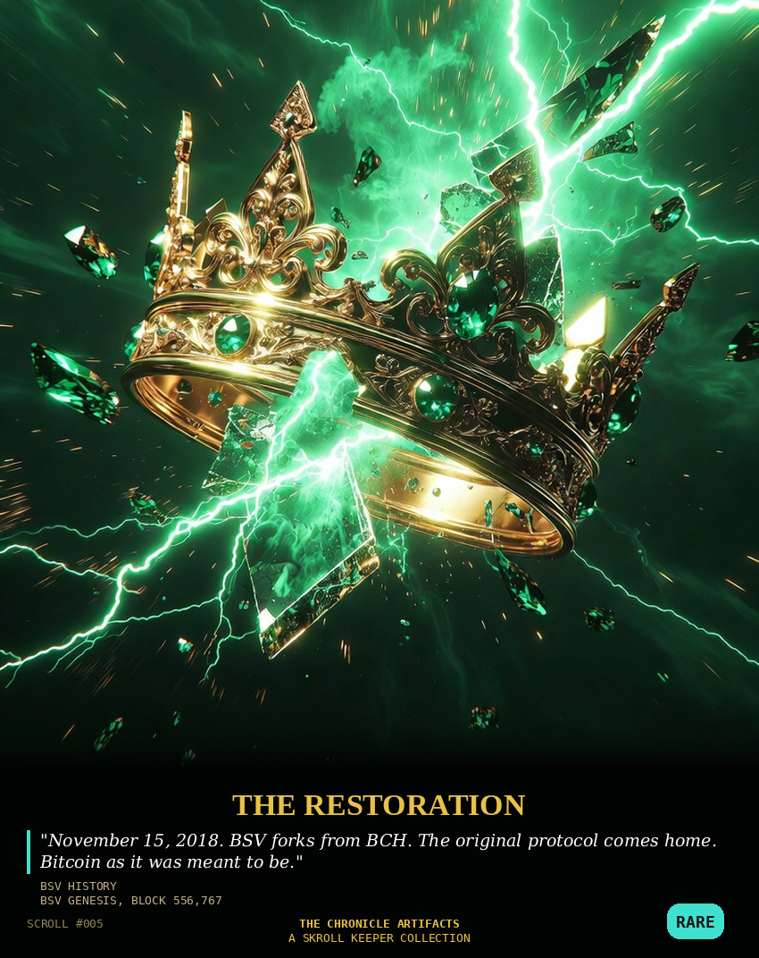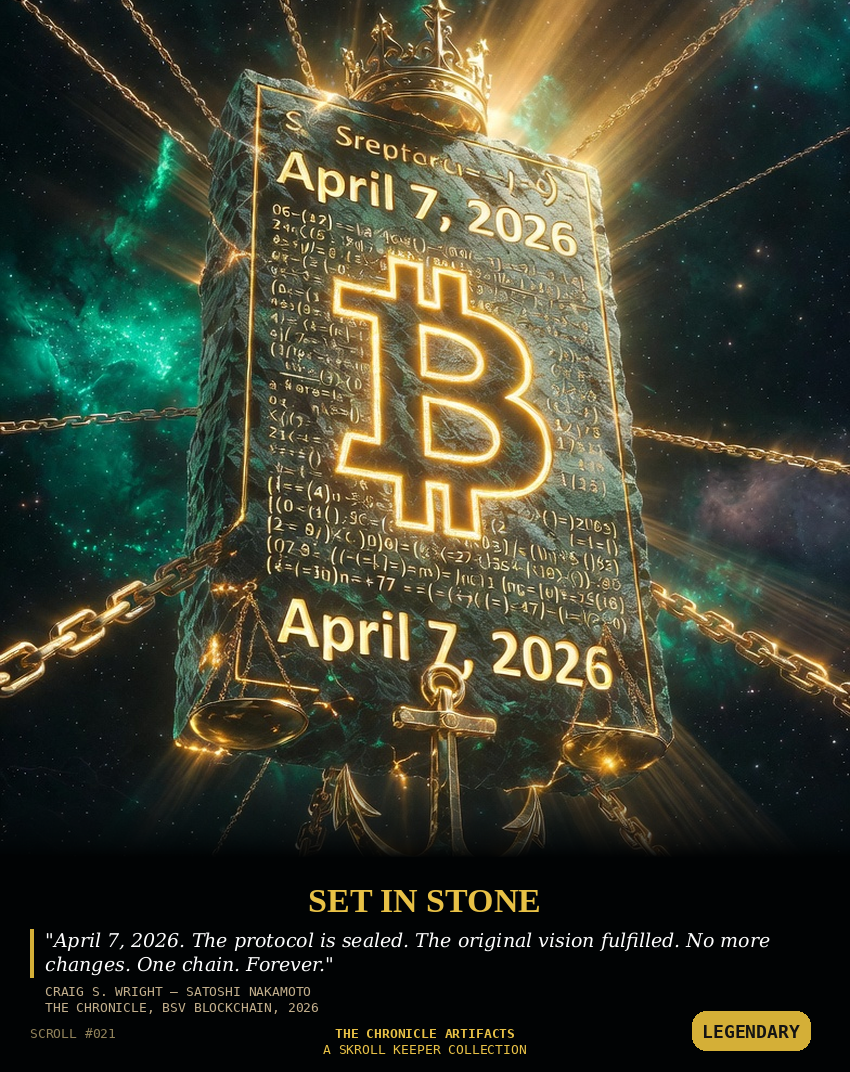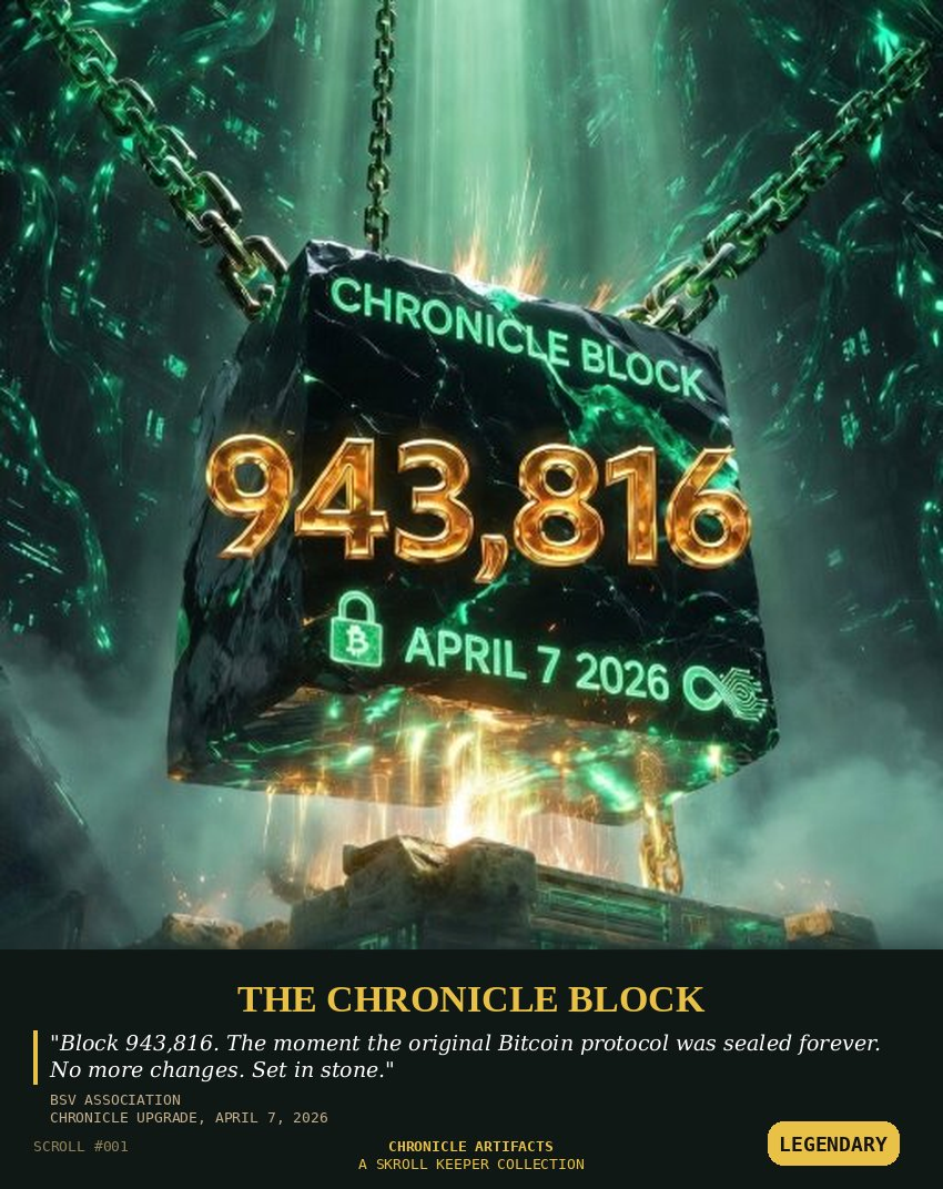 Description: The Chronicle Artifacts is the permanent record of the day the protocol wars end and Bitcoin becomes what Satoshi Nakamoto always meant it to be: honest, scalable, and unchangeable. These unique NFT inscriptions capture the historic milestones and immutable artifacts of the Chronicle Block on April 7, 2026. These are not mere NFTs. They are the on-chain record of Bitcoin’s final victory. The truth is now set in stone.
