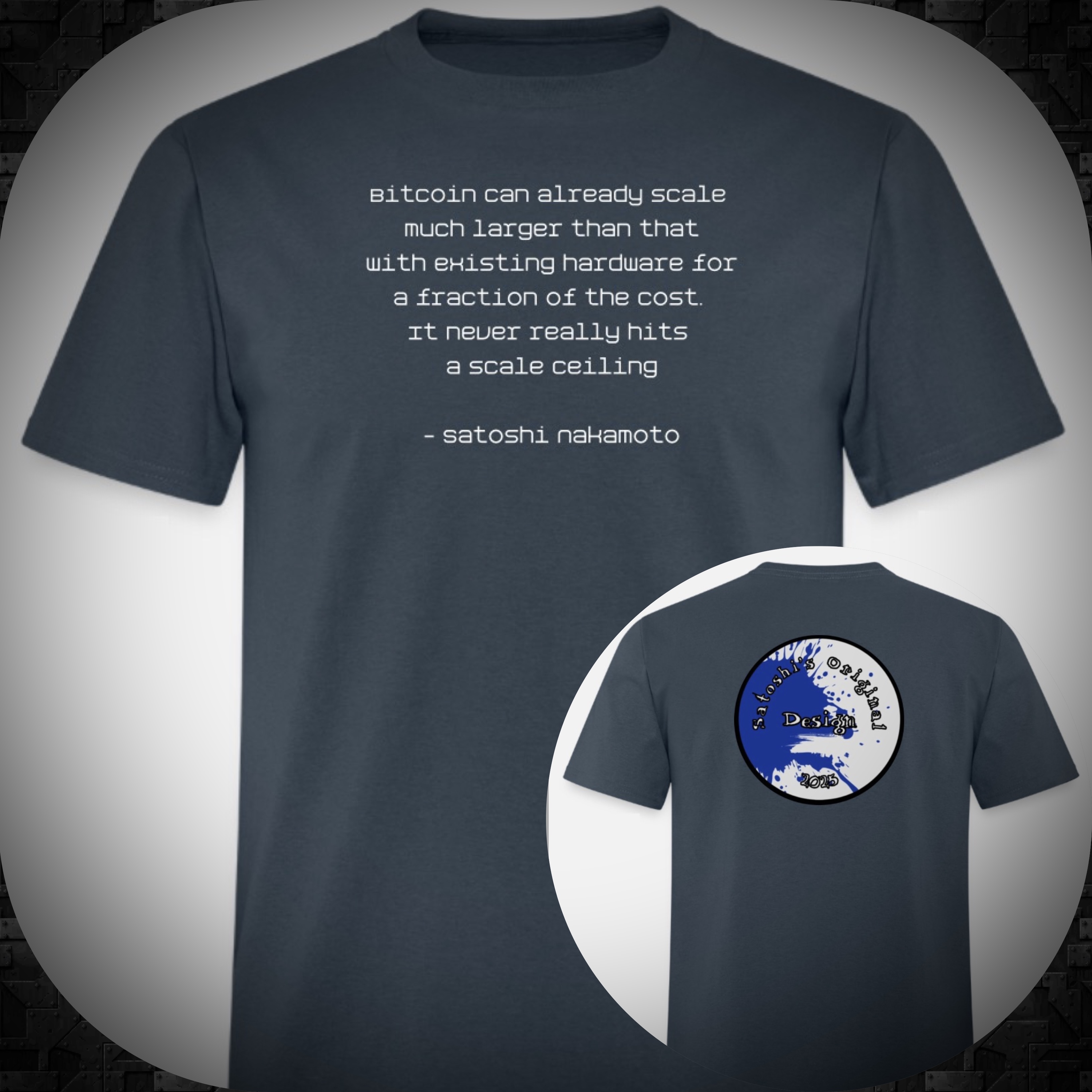 Description: Limited edition release tee with quote "Bitcoin can already scale much larger than that with existing hardware for a fraction of the cost. It never really hits a scale ceiling" - Satoshi Nakamoto. The owner of this ordinal has the option to purchase the physical shirt via X account @SatoshisDesign