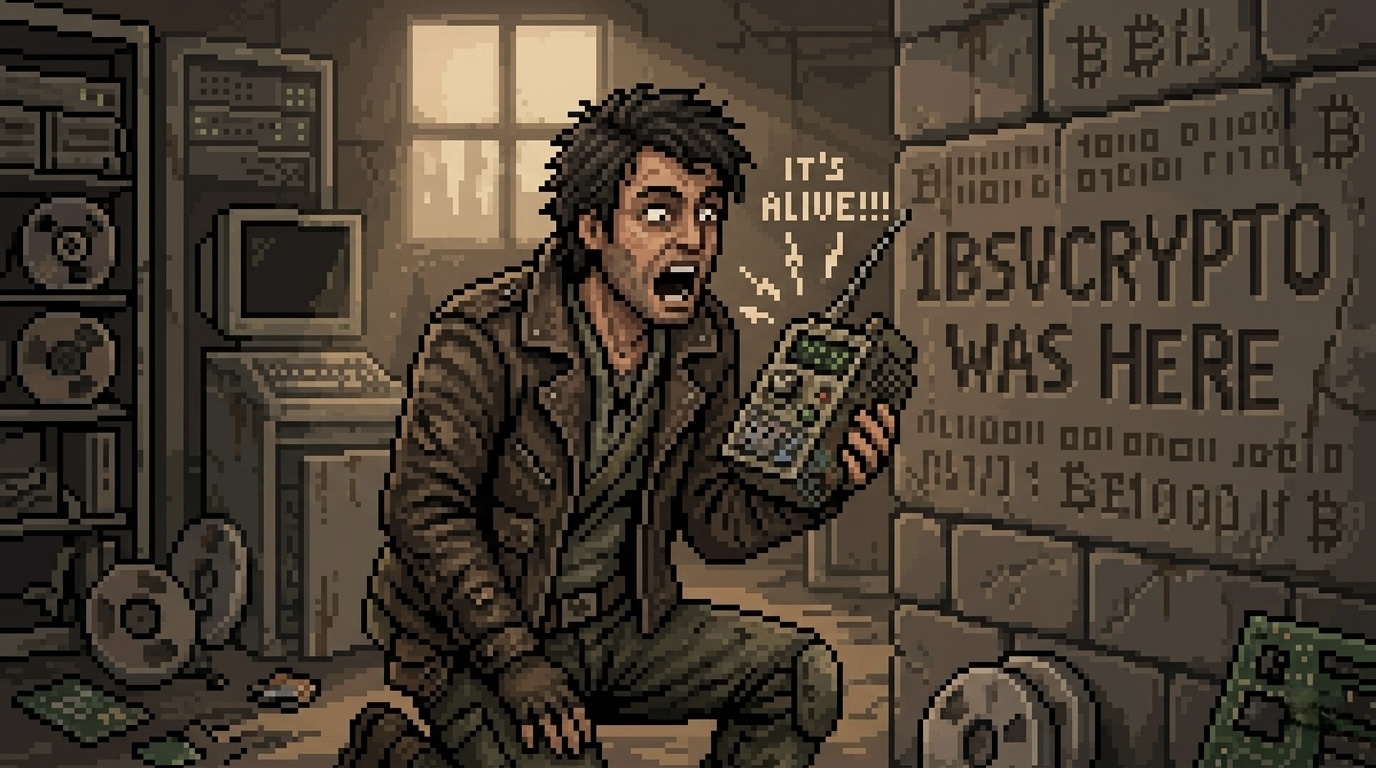 Description: Tracking a secret signal, he finds the hidden shelter and "1BSVCRYPTO WAS HERE" carved on the wall. He realizes the leader they thought was dead is still out there, guarding the chain. He shouts over the radio: "IT'S ALIVE!". To be continued...