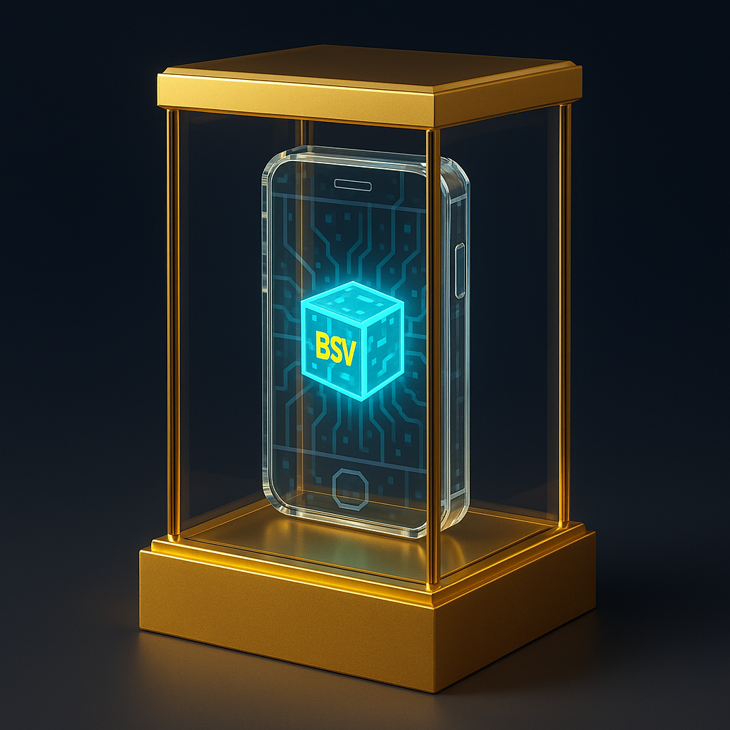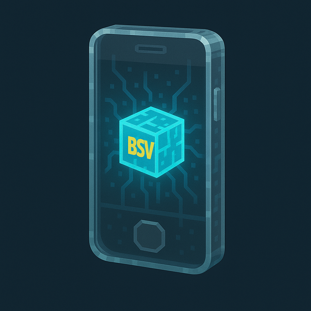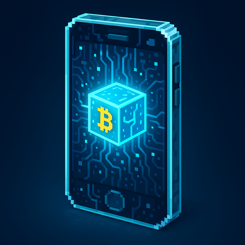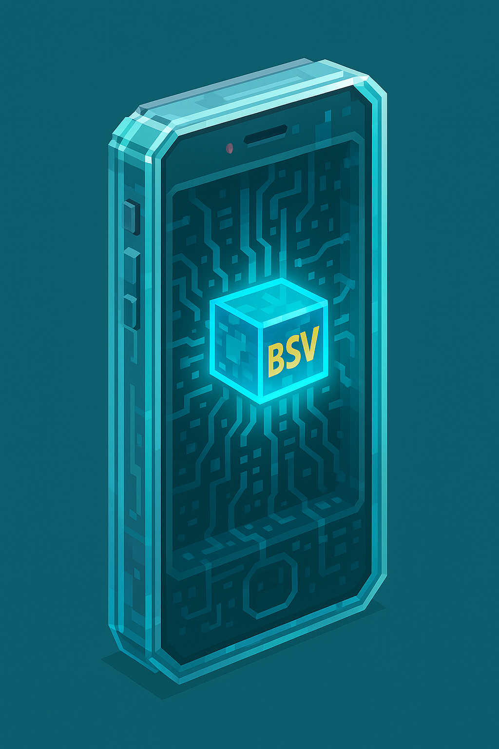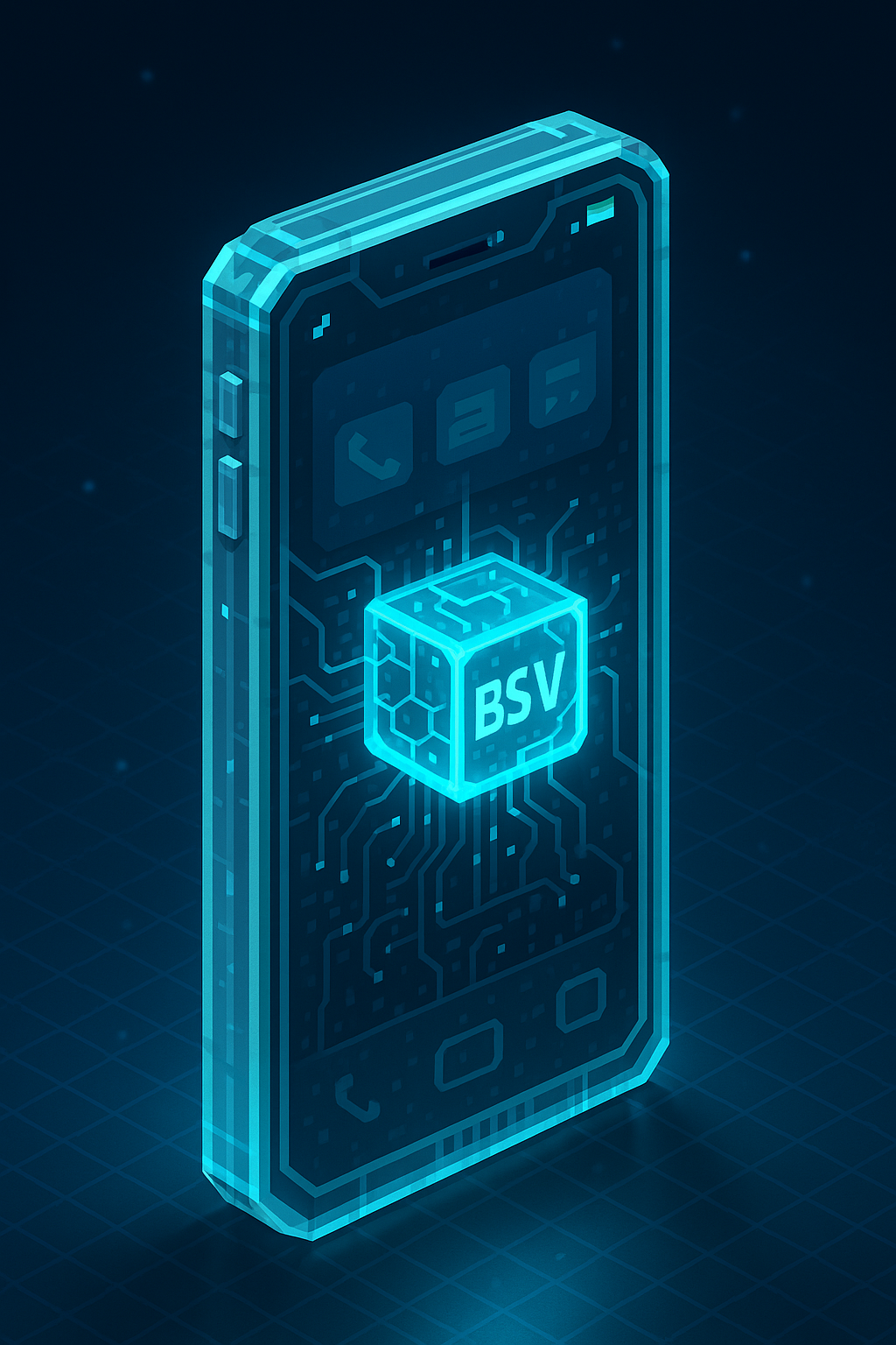 Description: Transparent BSV Phone glowing with a digital cube core and circuit lines in a sleek pixel-art style. glowing with a digital cube core and circuit lines in a sleek pixel-art style.