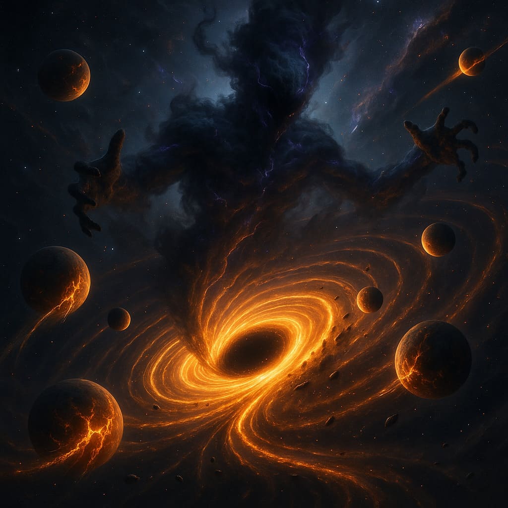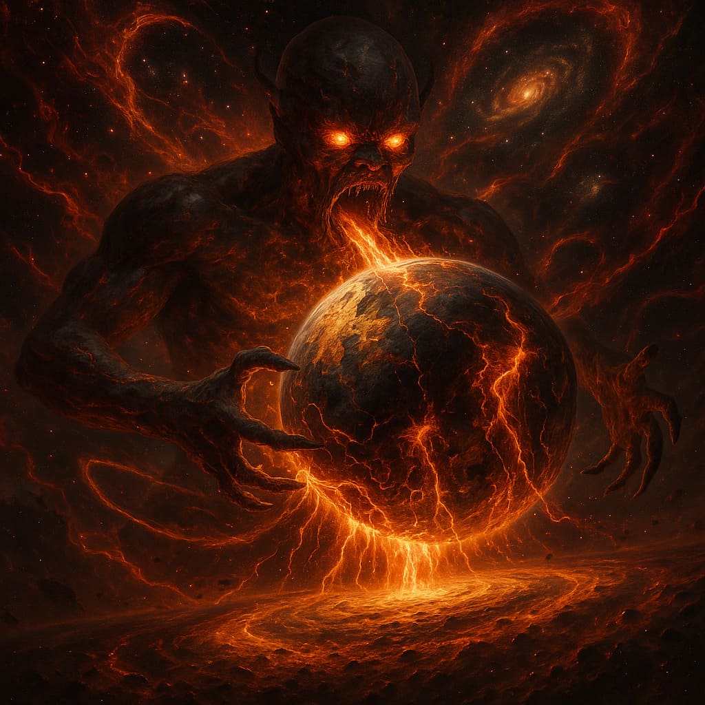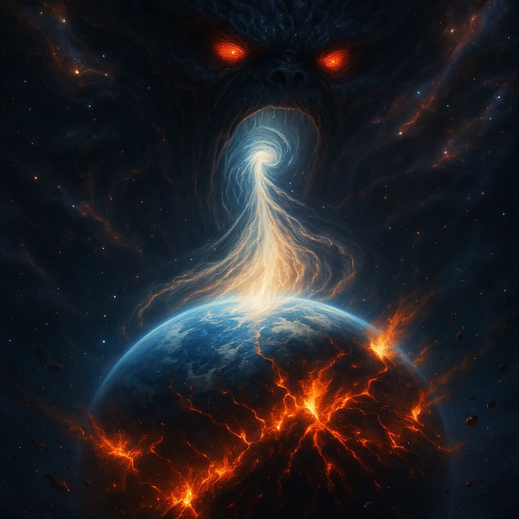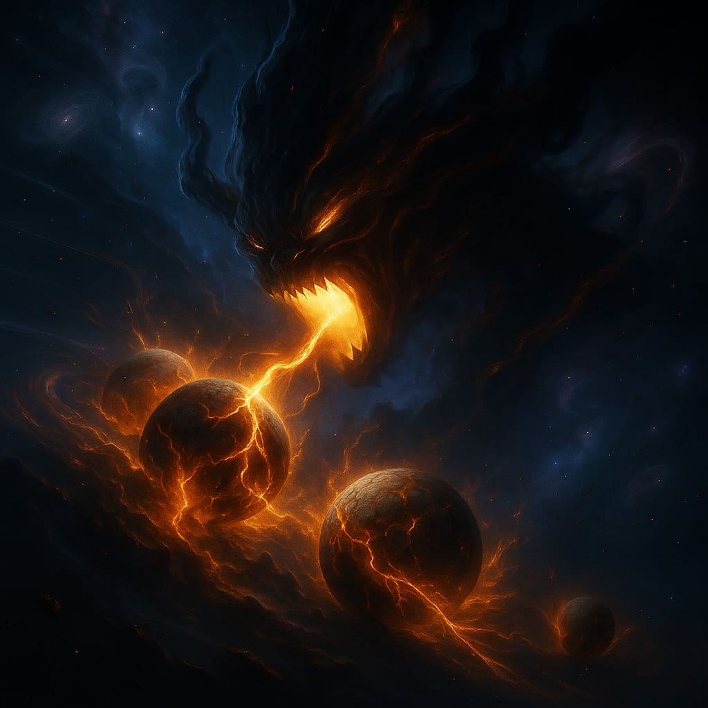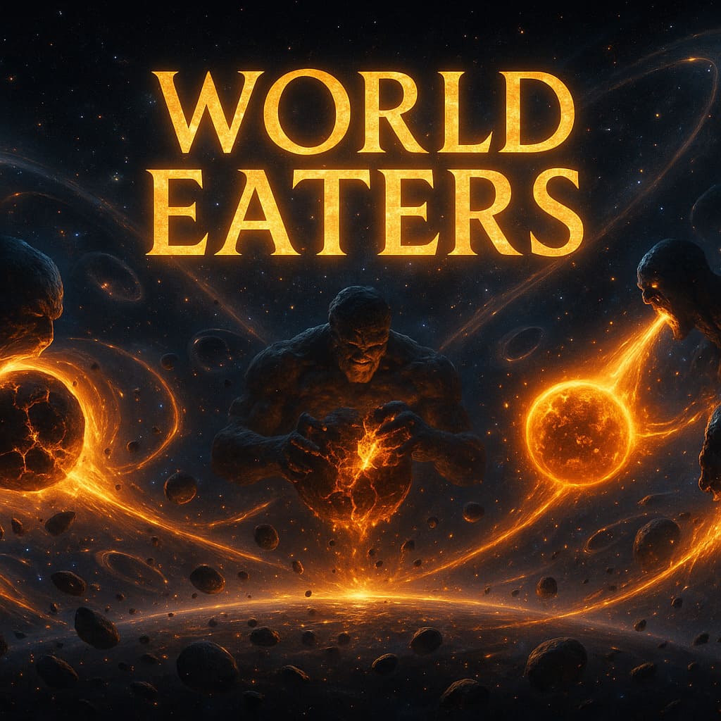 Description: Colossal cosmic beings consuming worlds - devourers of matter and energy, feeding upon the dying light of galaxies in an endless cosmic feast.