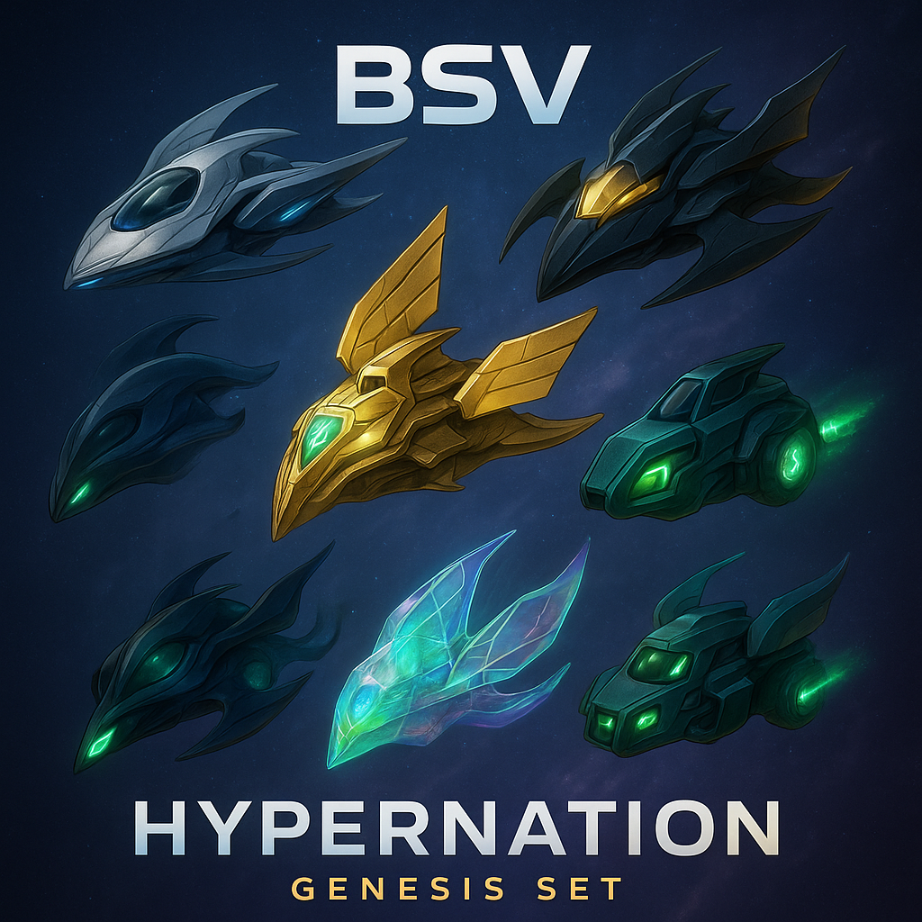Description: Genesis Set: Six 3D interactive spacecraft NFTs powered by BSV, blending futuristic design, cosmic lore, and immersive interstellar experiences.