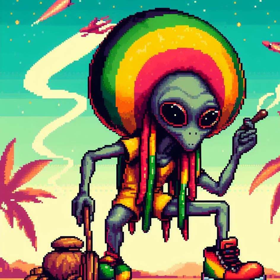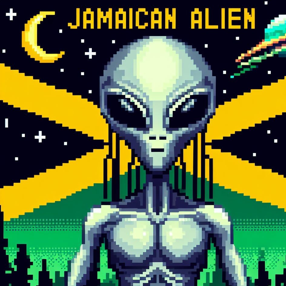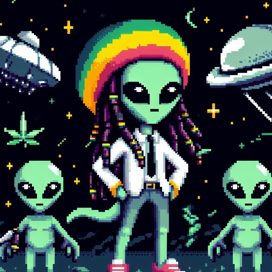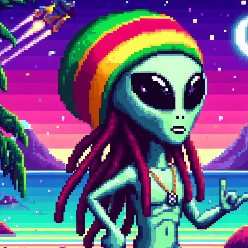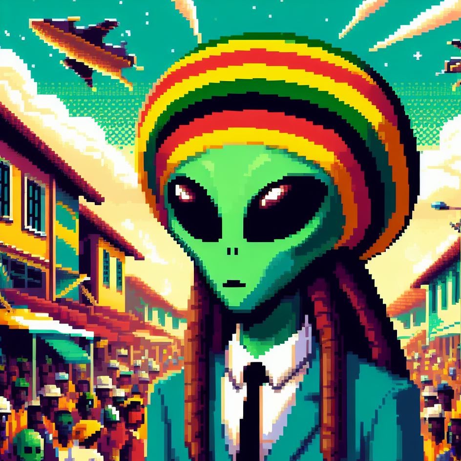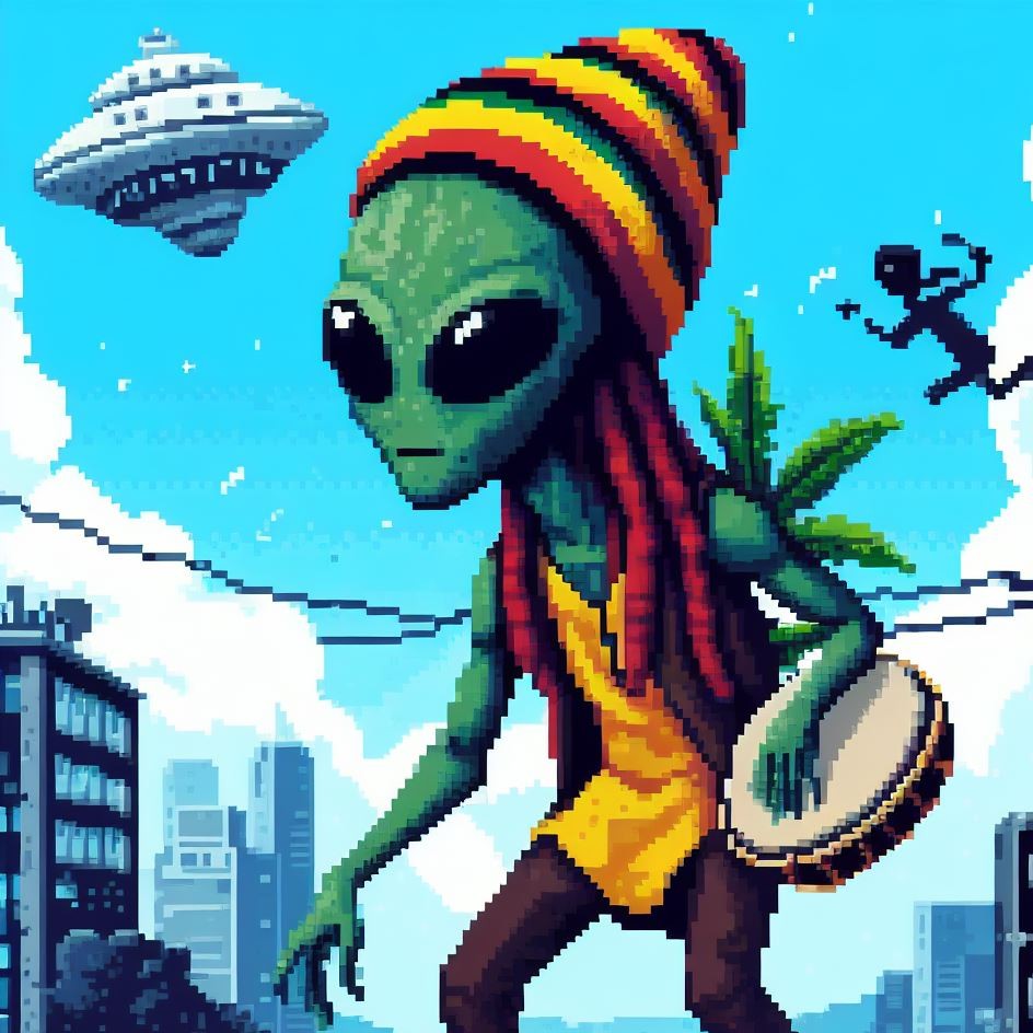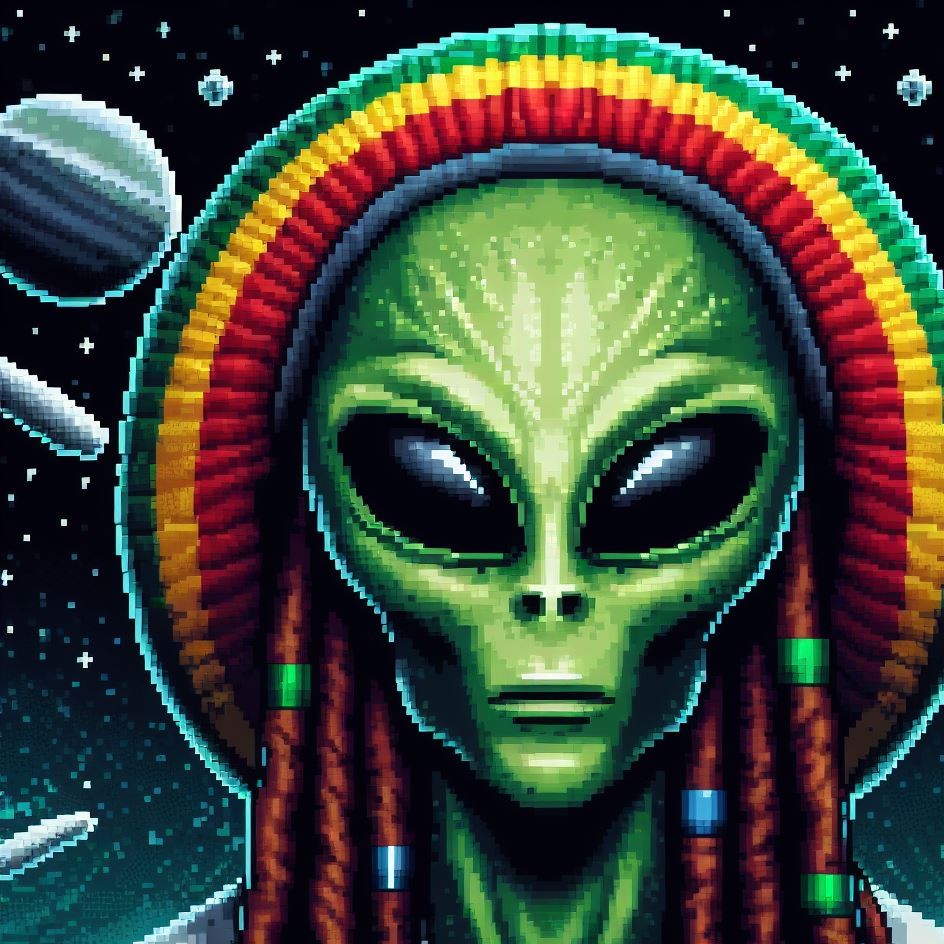 Description: Step into a world where interstellar vibes meet reggae rhythms as Alien Vibe, the Rasta Alien from Jamaica, takes you on a journey beyond the stars.
