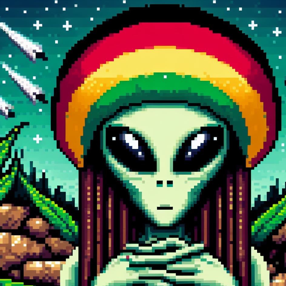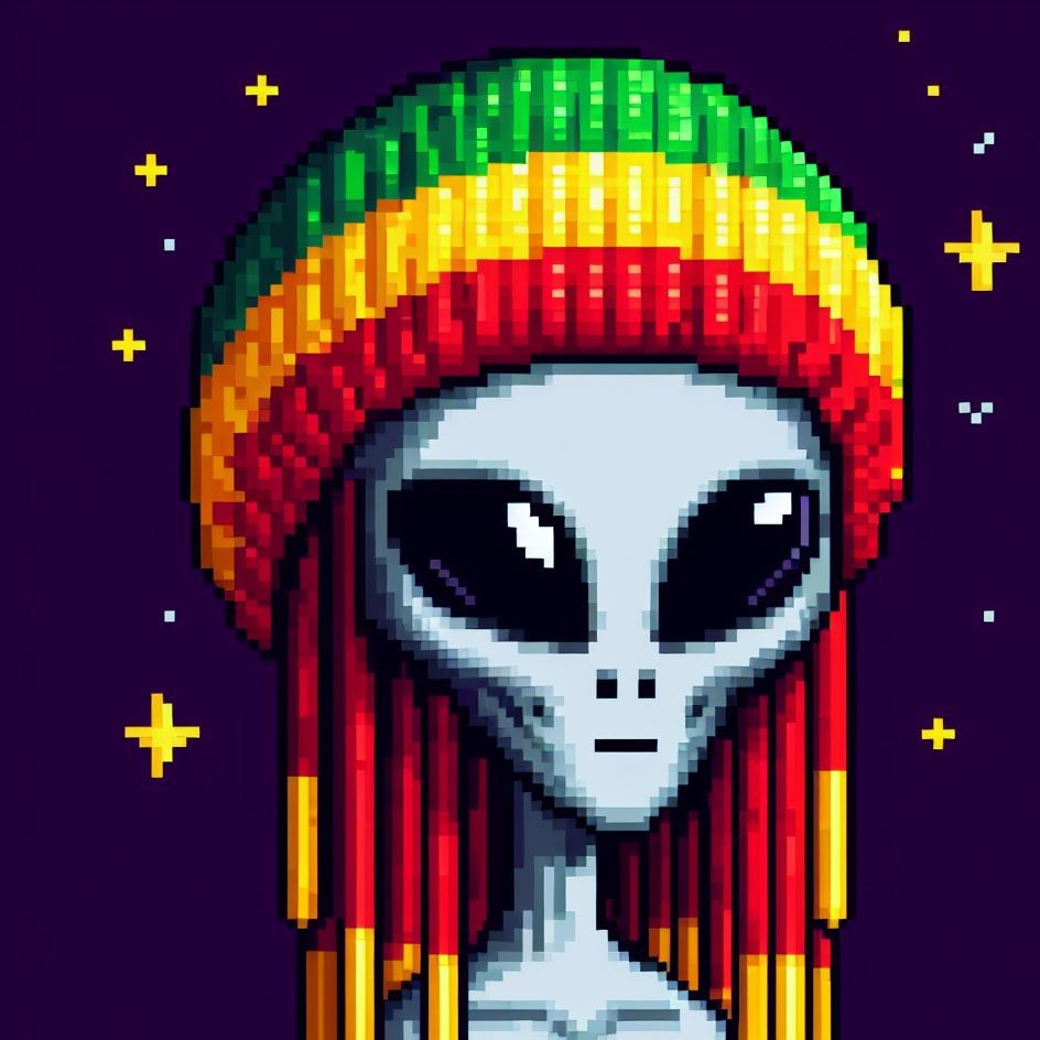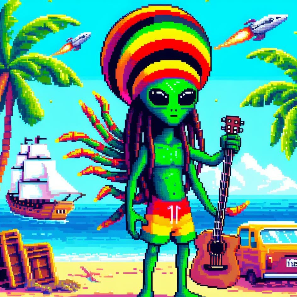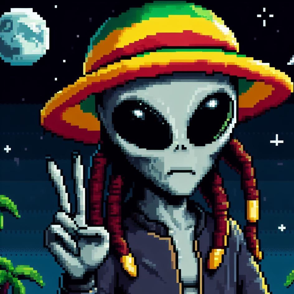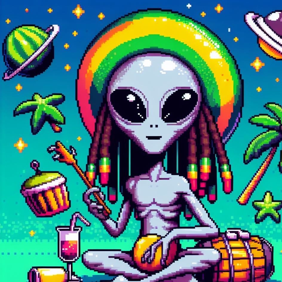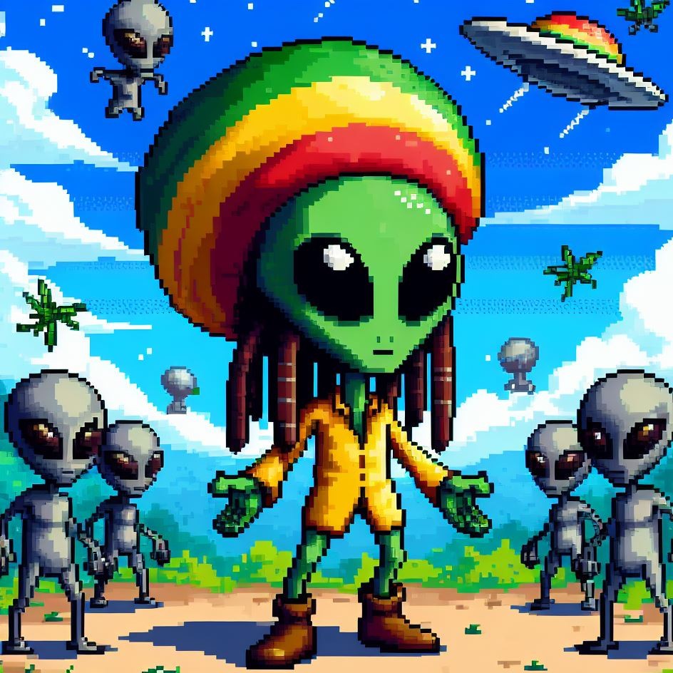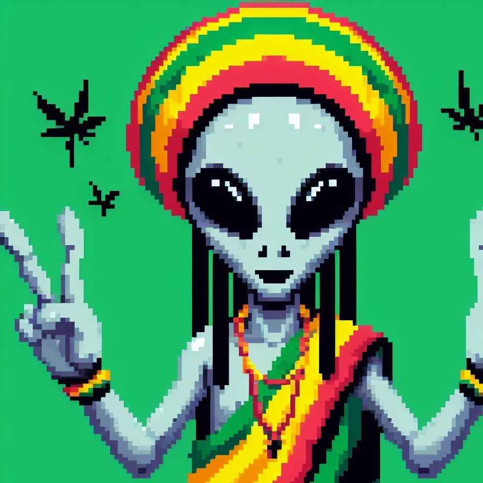 Description: Step into a world where interstellar vibes meet reggae rhythms as Alien Vibe, the Rasta Alien from Jamaica, takes you on a journey beyond the stars.