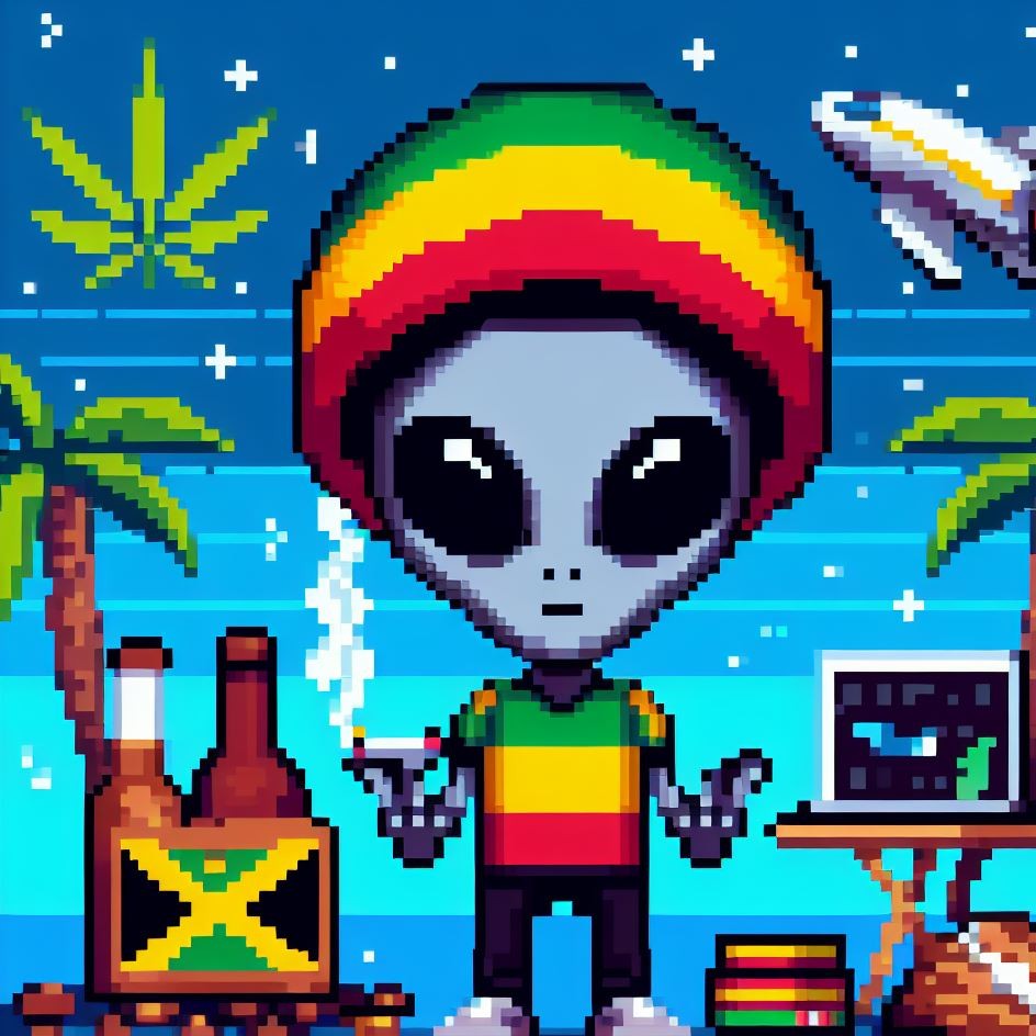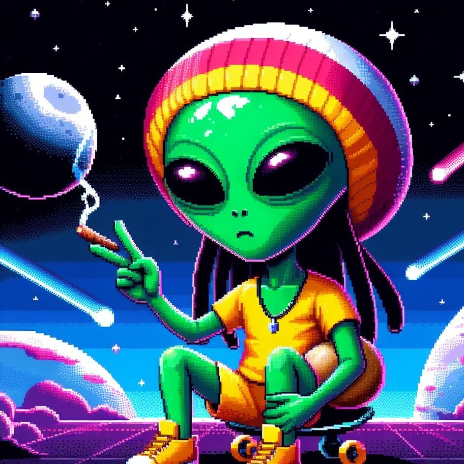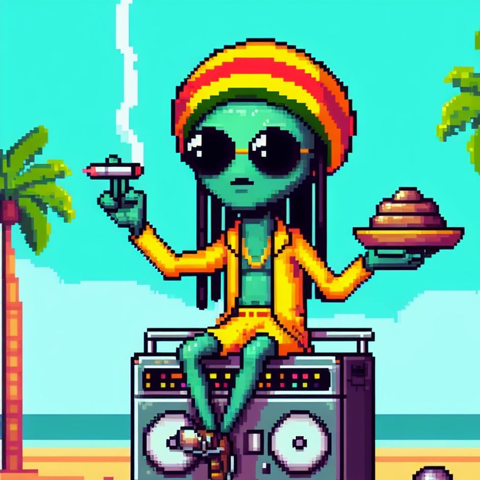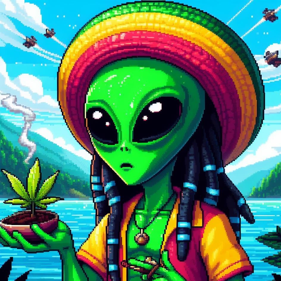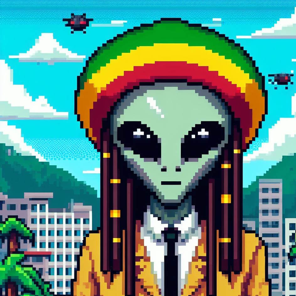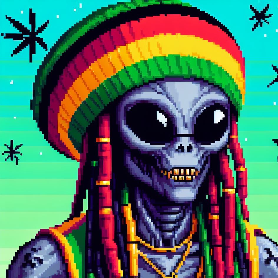 Description: Step into a world where interstellar vibes meet reggae rhythms as Alien Vibe, the Rasta Alien from Jamaica, takes you on a journey beyond the stars.