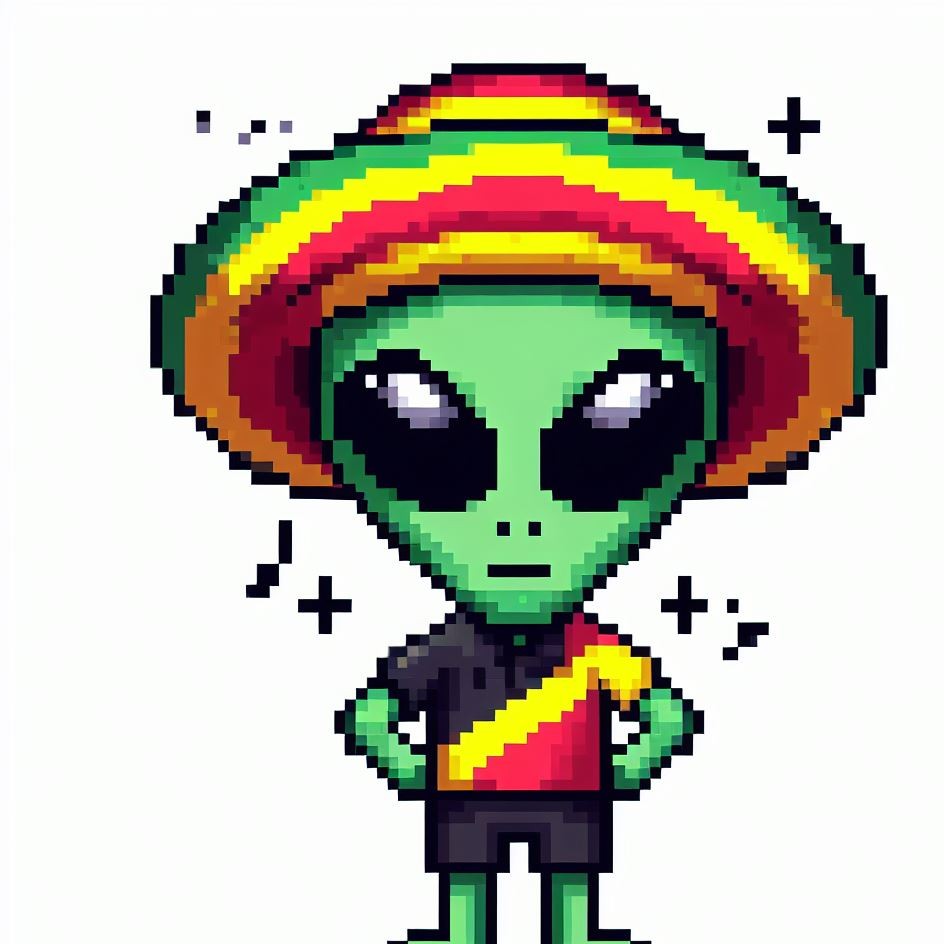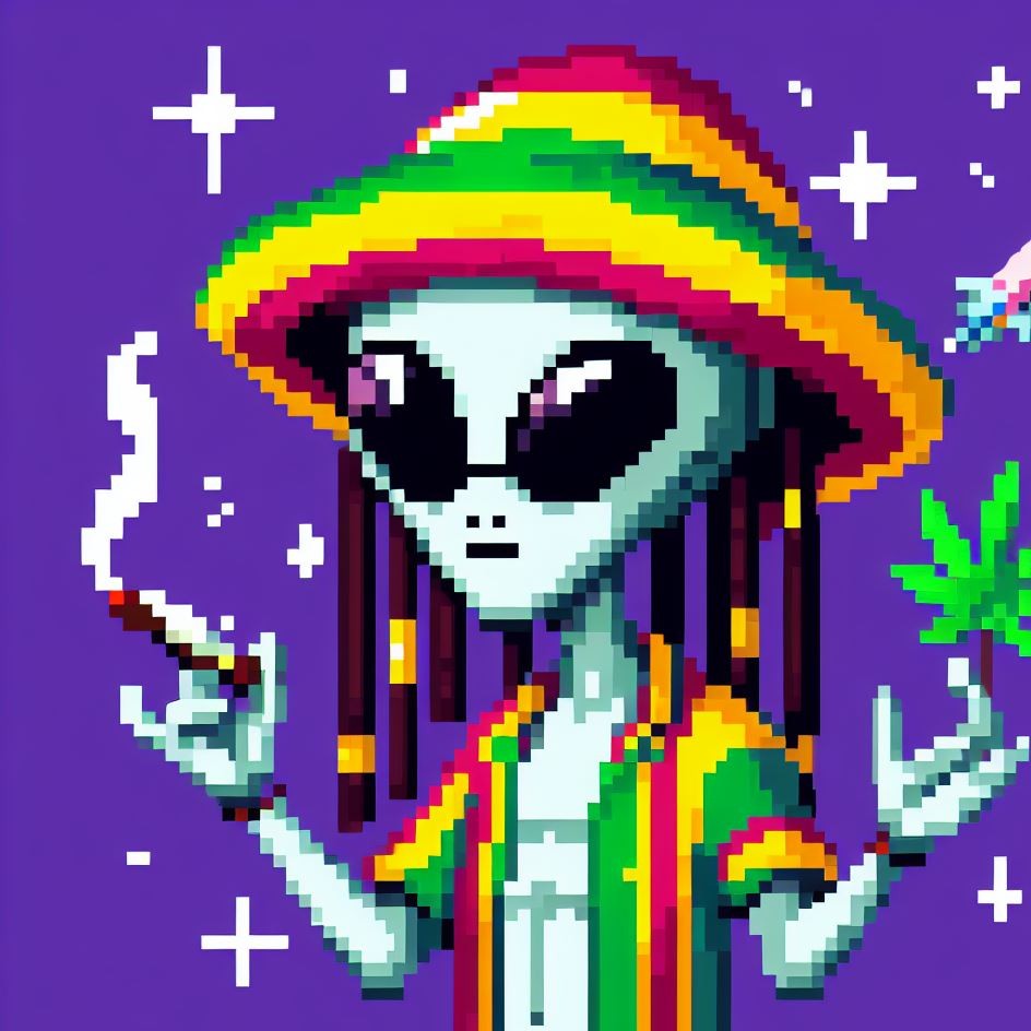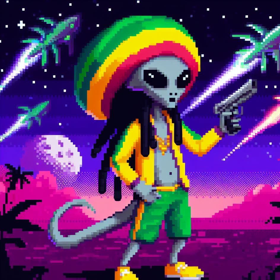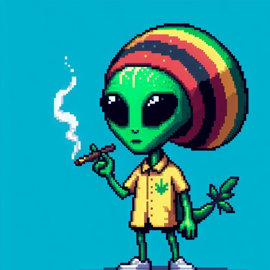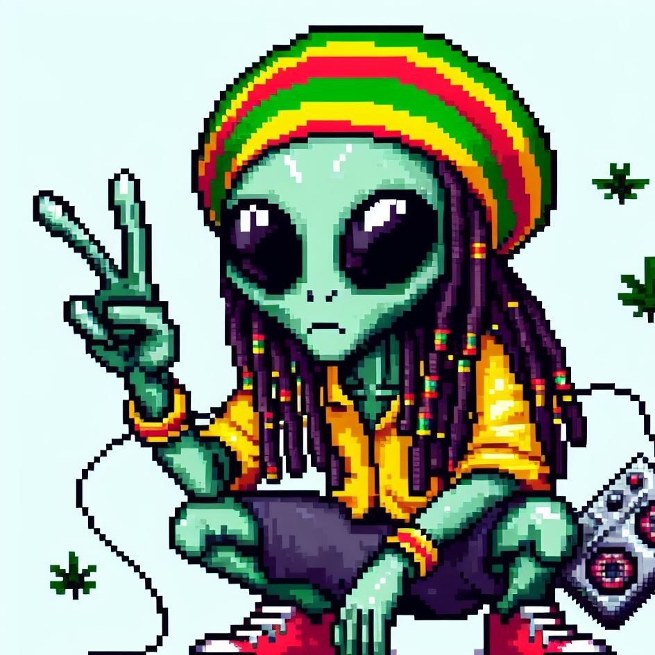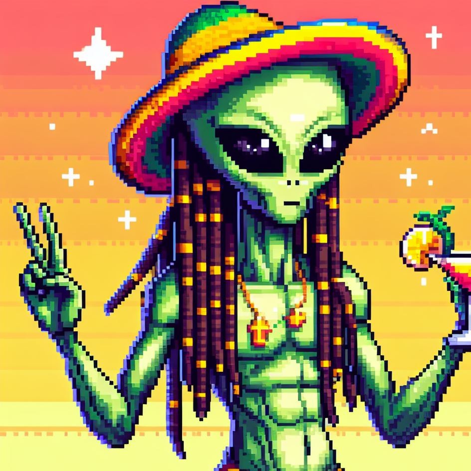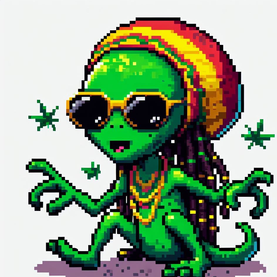 Description: Step into a world where interstellar vibes meet reggae rhythms as Alien Vibe, the Rasta Alien from Jamaica, takes you on a journey beyond the stars.