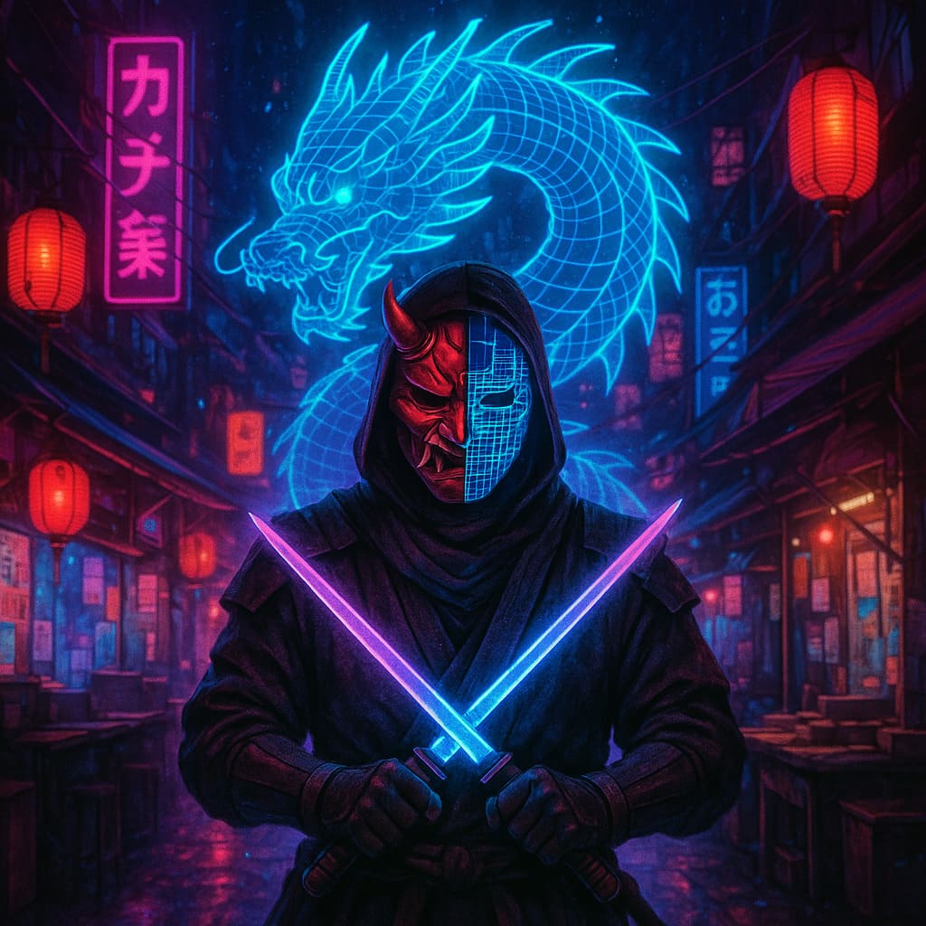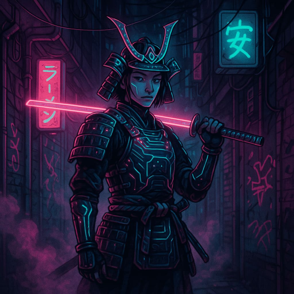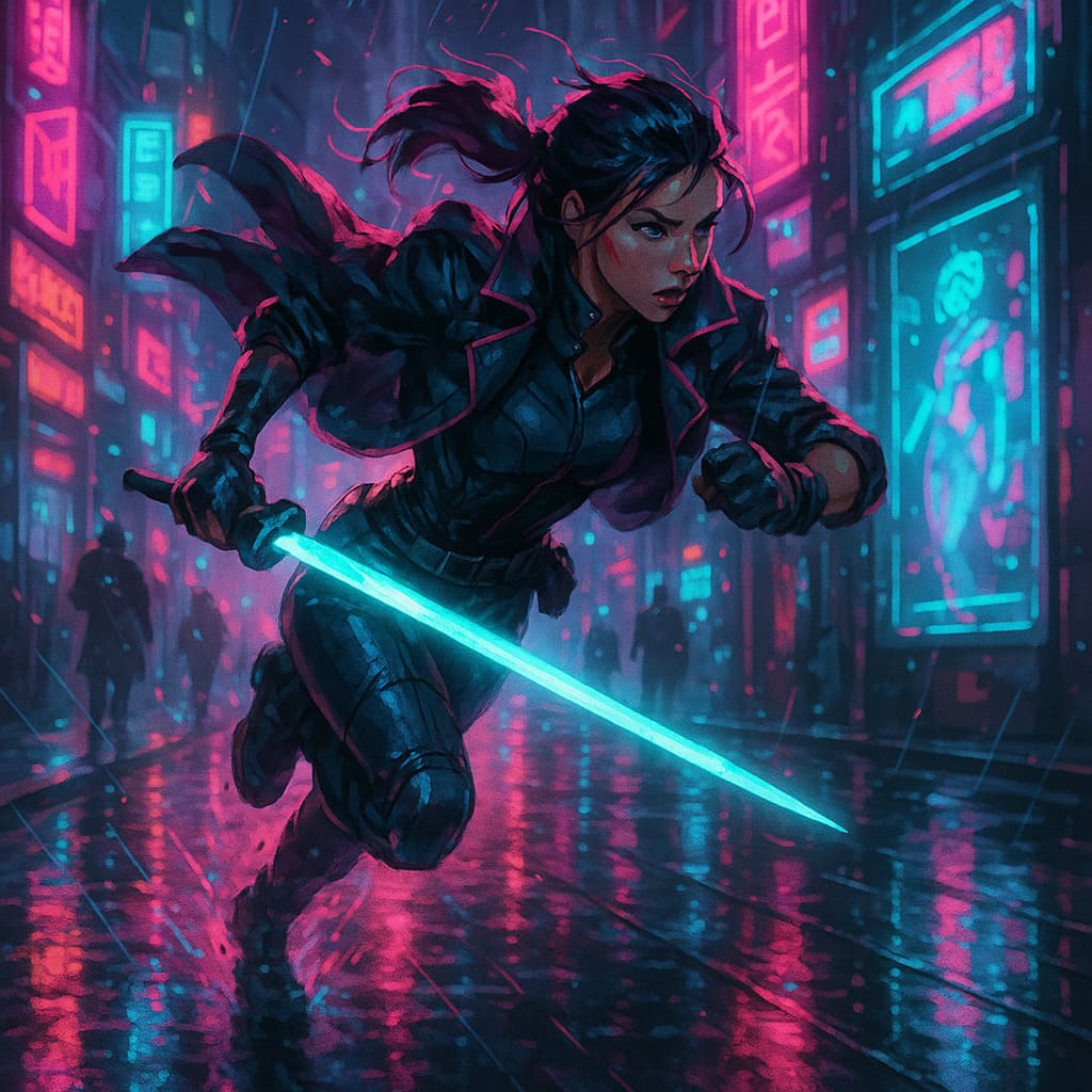 Description: A collection of futuristic warriors glowing in neon, crossing rain-soaked cyberpunk cities with energy blades, speed and attitude