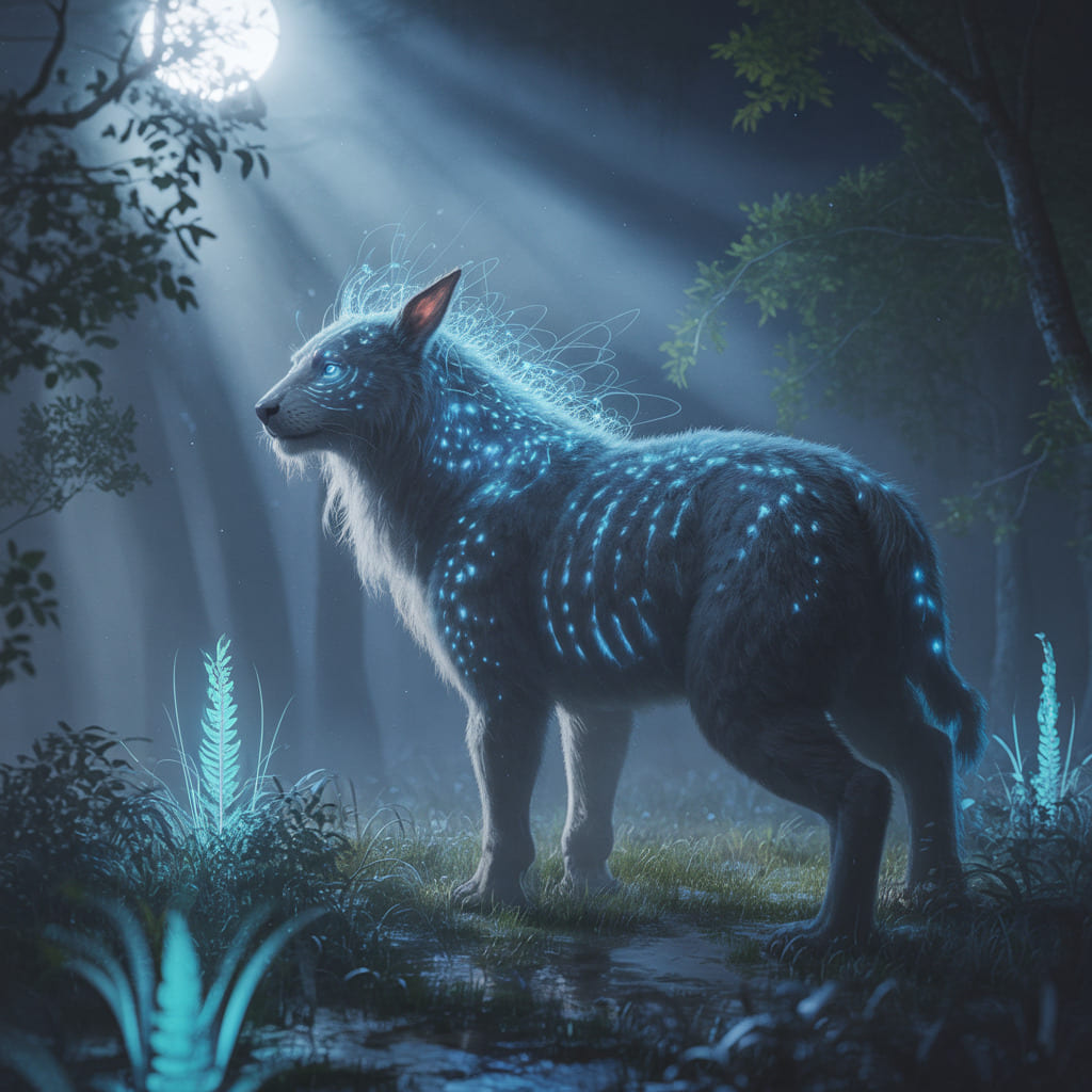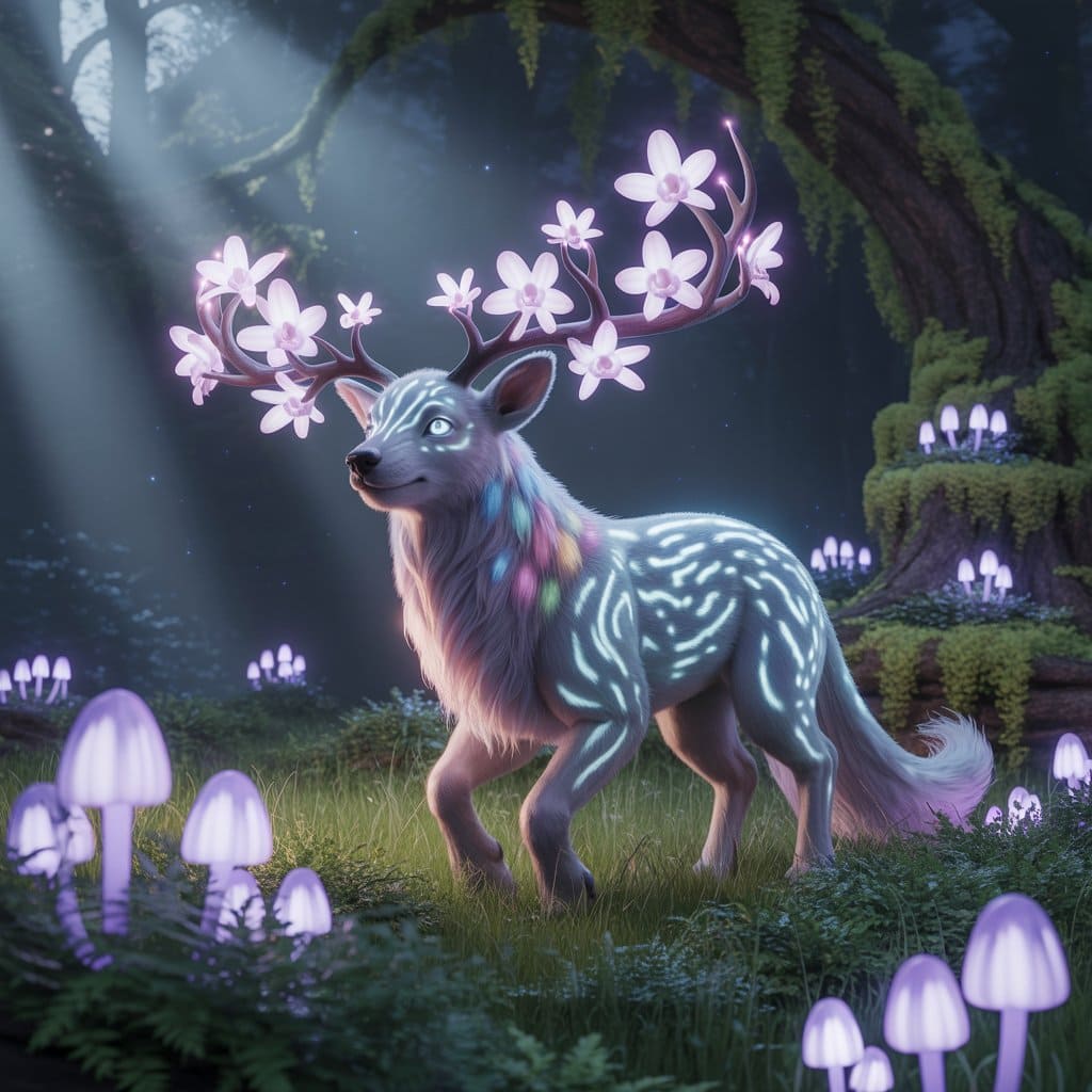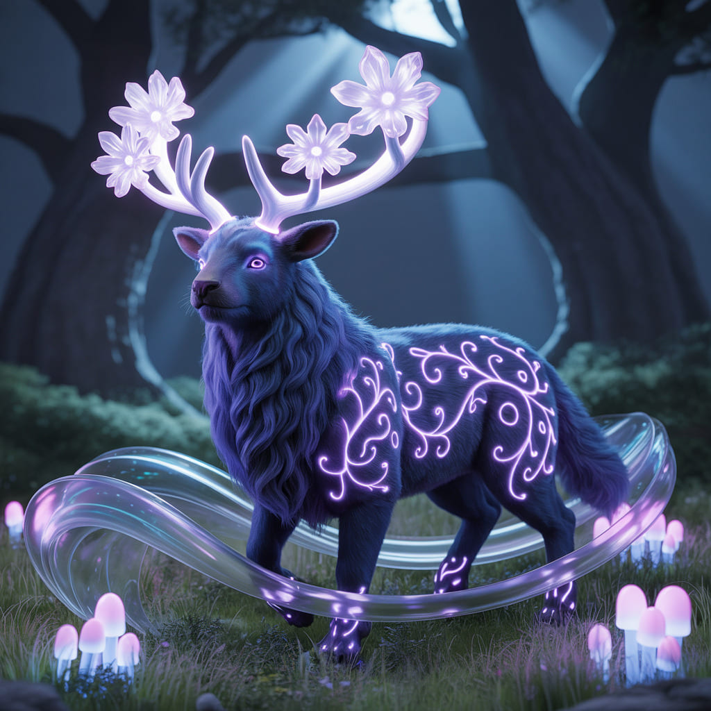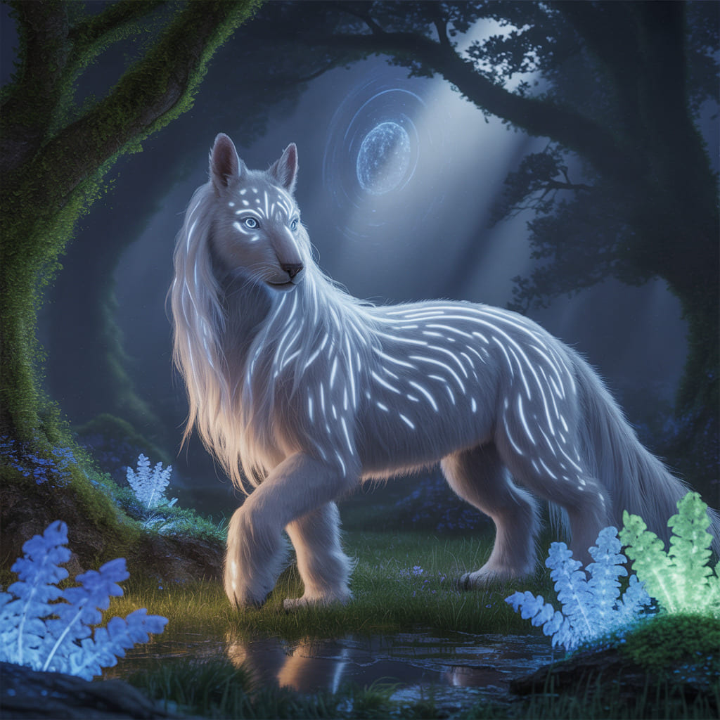 Description: A mystical world bathed in eternal twilight, where ethereal animals radiate a soft, inner light. In this dreamlike realm, time flows gently and magic pulses through every living being.