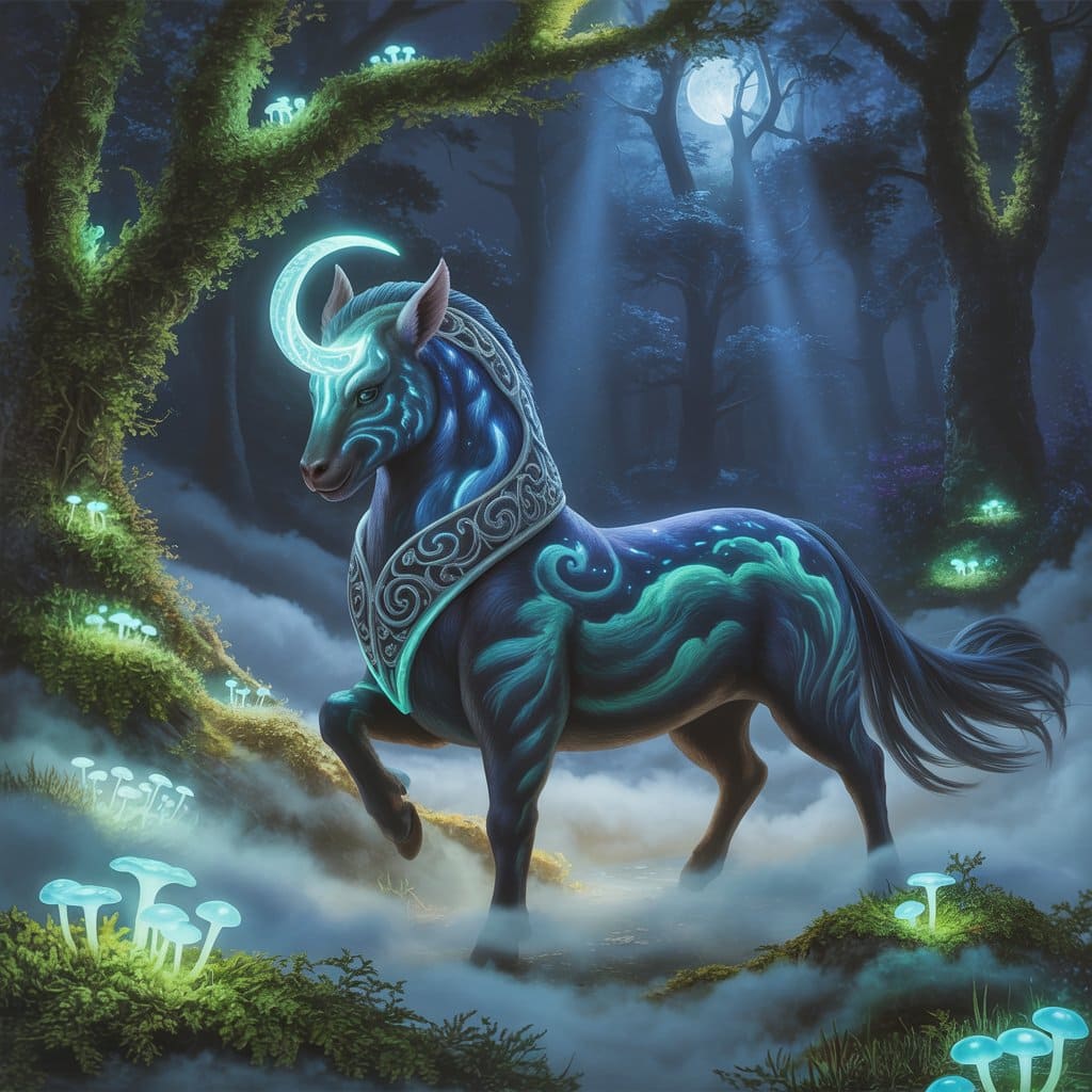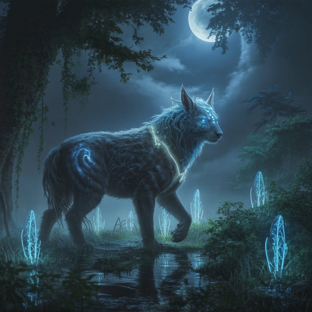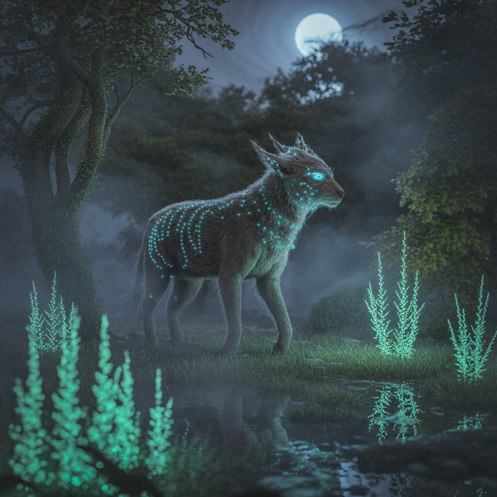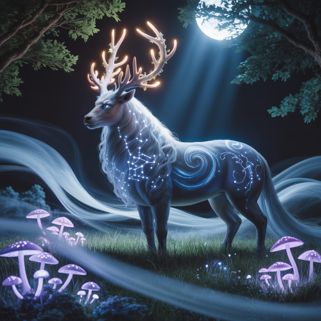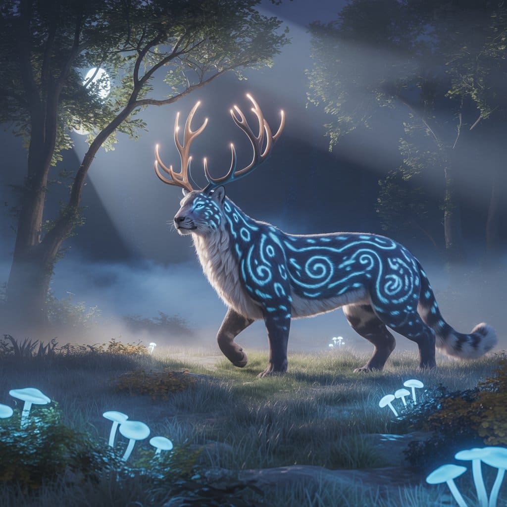 Description: A mystical world bathed in eternal twilight, where ethereal animals radiate a soft, inner light. In this dreamlike realm, time flows gently and magic pulses through every living being.