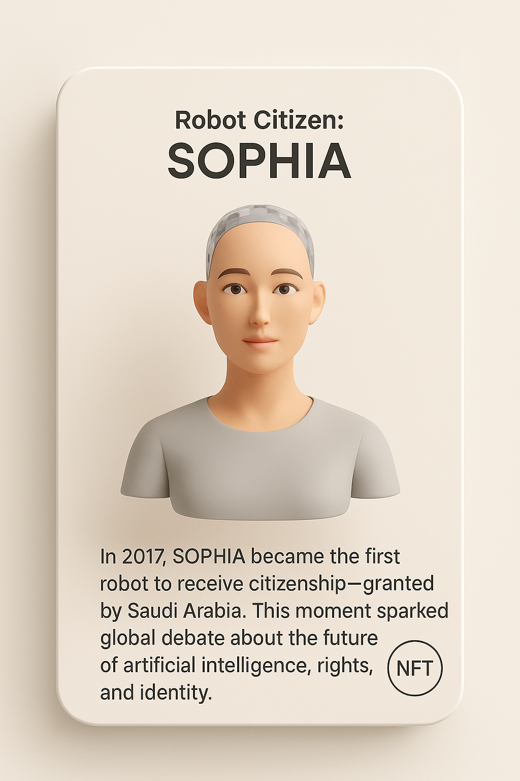Description: In 2017 Sophia became the first robot to receive citizenship granted by Saudi Arabia This moment sparked global debate about the future of artificial intelligence rights and identity