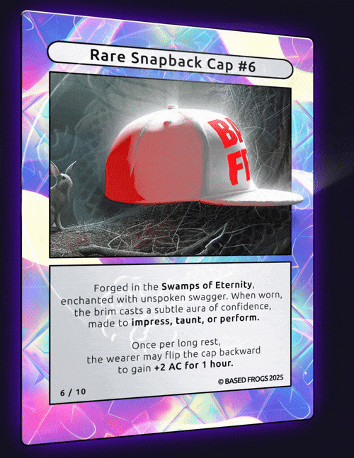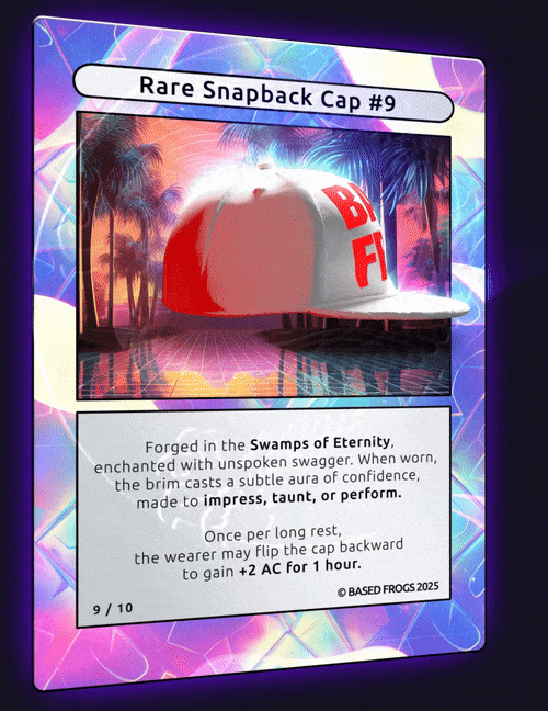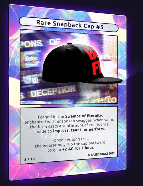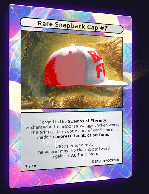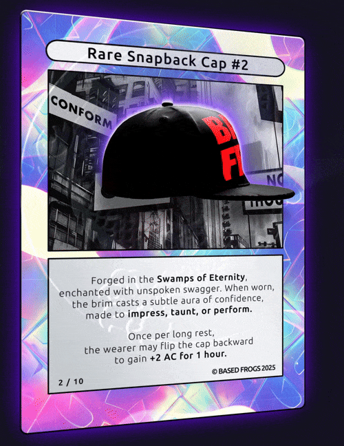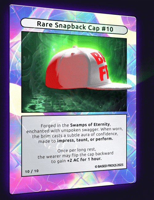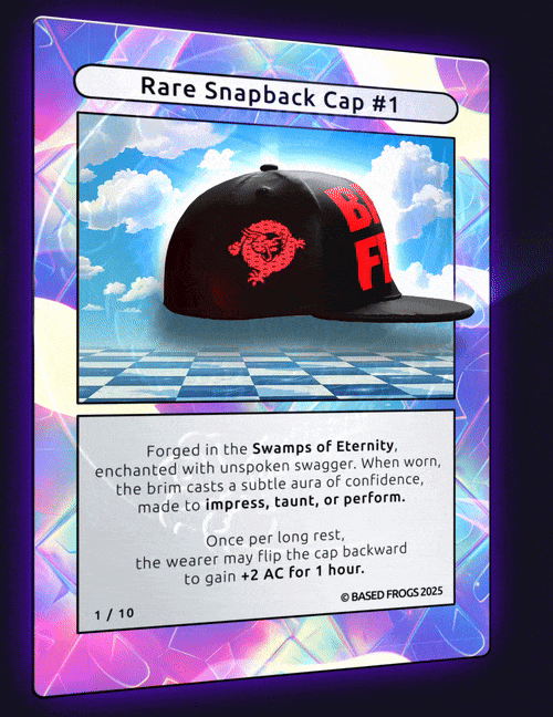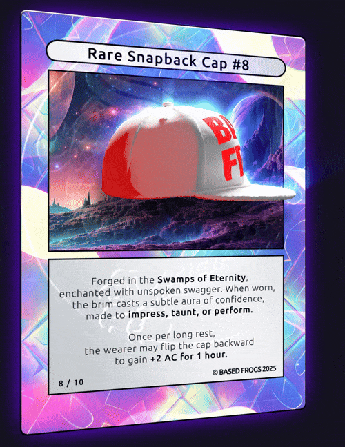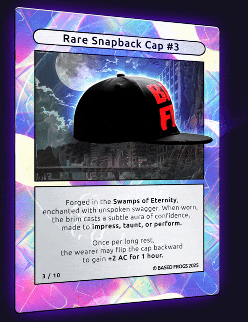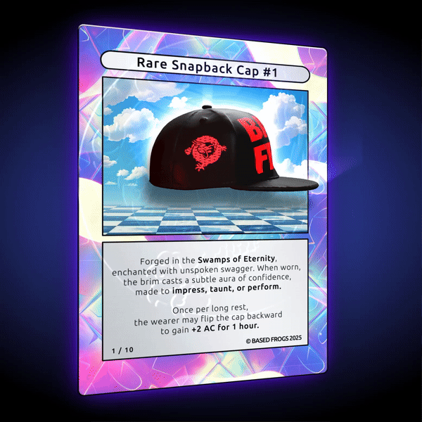 Description: 10/10 BASED FROGS Rare Snapback Cap Comes with physical item. To redeem contact basedfrogs@gmail.com