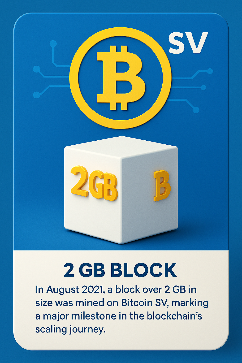 Description: Iconic Bitcoin SV Fact In August 2021, Bitcoin SV set a world record by mining a single block over 2 gigabytes in size, proving its capability to scale and process massive amounts of data directly onchain.