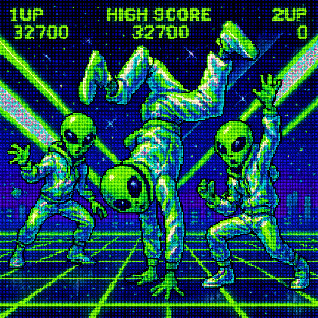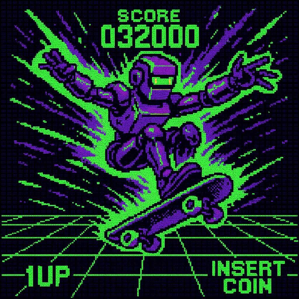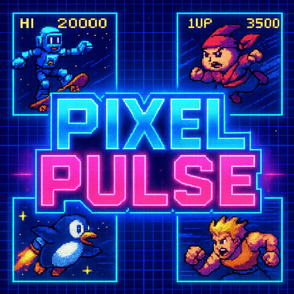 Description: Pixel Pulse captures the electric energy of 2000s arcade splash screens with vibrant pixel art. It celebrates video game nostalgia with dynamic action poses and a bright retro aesthetic that transports viewers back to the golden age of arcades.